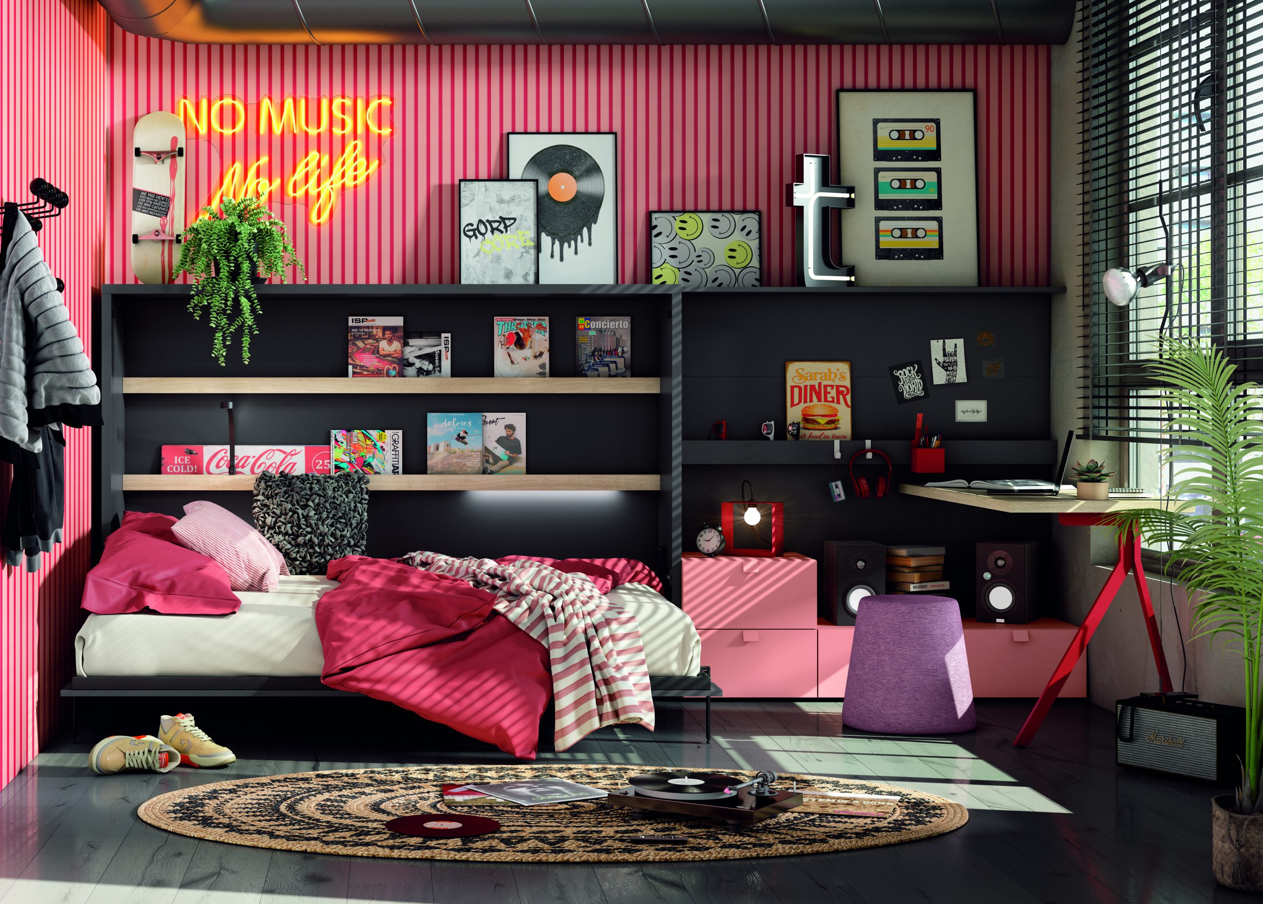 En conclusión, el dormitorio juvenil Ros Delulu 57 combina elegancia, funcionalidad y diseño. Su estructura abatible, su zona de estudio integrada y sus detalles metálicos lo convierten en una opción perfecta para quienes buscan un espacio juvenil moderno, práctico y bien aprovechado.