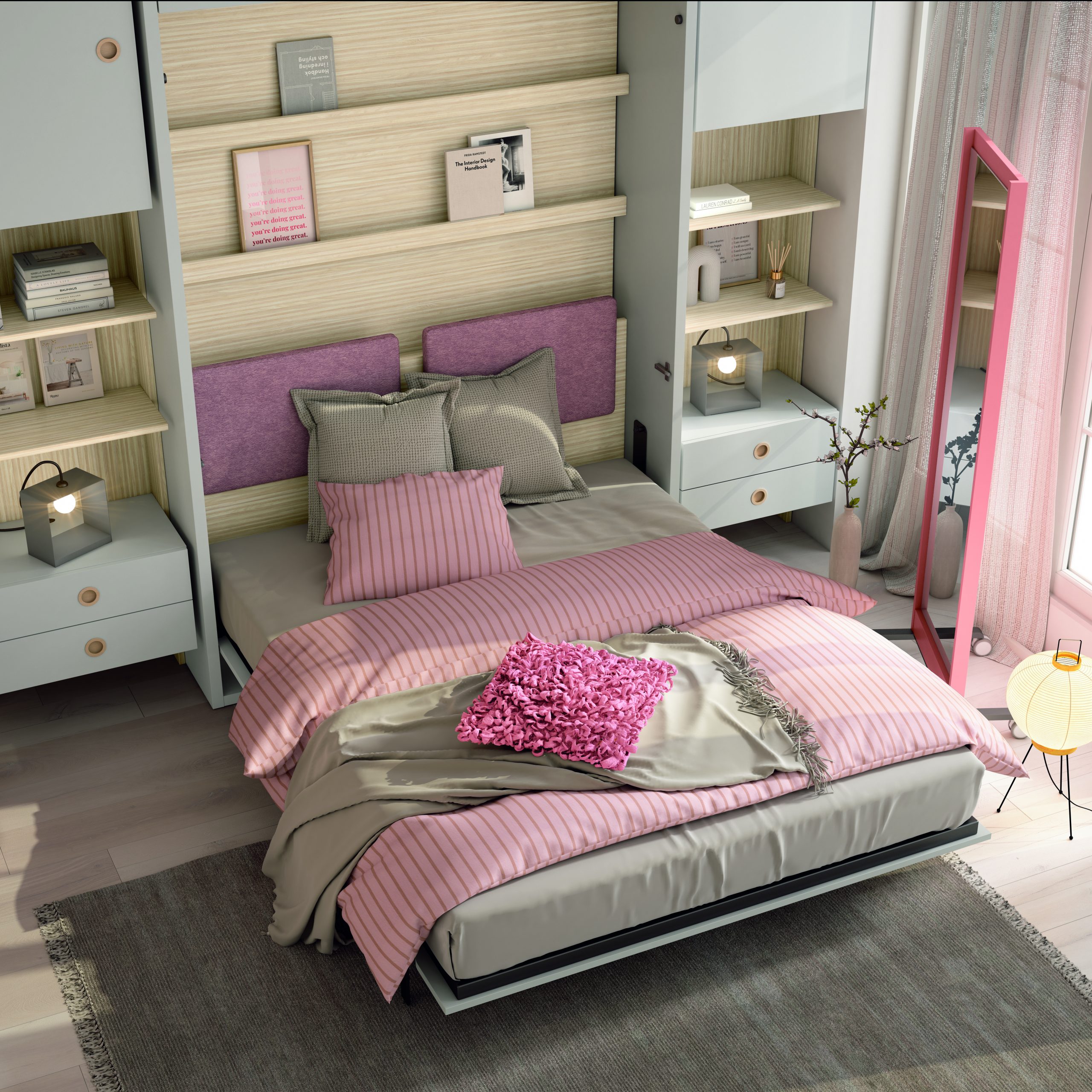 El dormitorio juvenil Ros Delulu 60 combina elegancia, orden y calidez en una propuesta funcional y moderna. Los tonos bambú, gris perla, gris arcilla y ópalo crean una atmósfera equilibrada, ideal para espacios juveniles actuales. Además, los tiradores modelo Sima en haya natural aportan un toque cálido y artesanal que realza la naturalidad del conjunto.
