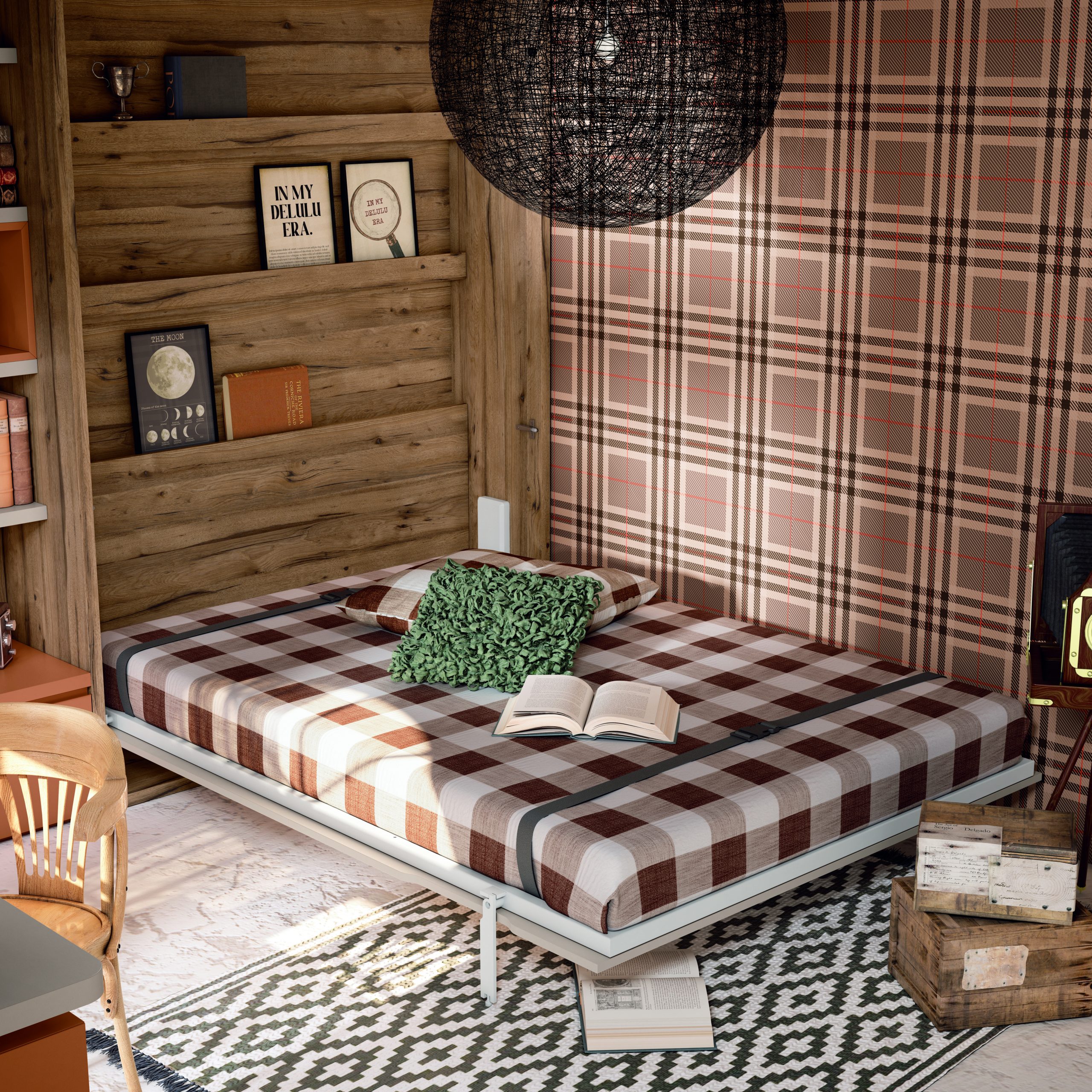 El conjunto incluye una cama vertical sin altillo (fondo 43 cm, 190 × 135 cm), ideal para estancias compactas. Su sistema abatible permite aprovechar al máximo el espacio disponible, ofreciendo una zona de descanso cómoda y discreta cuando la cama está cerrada.