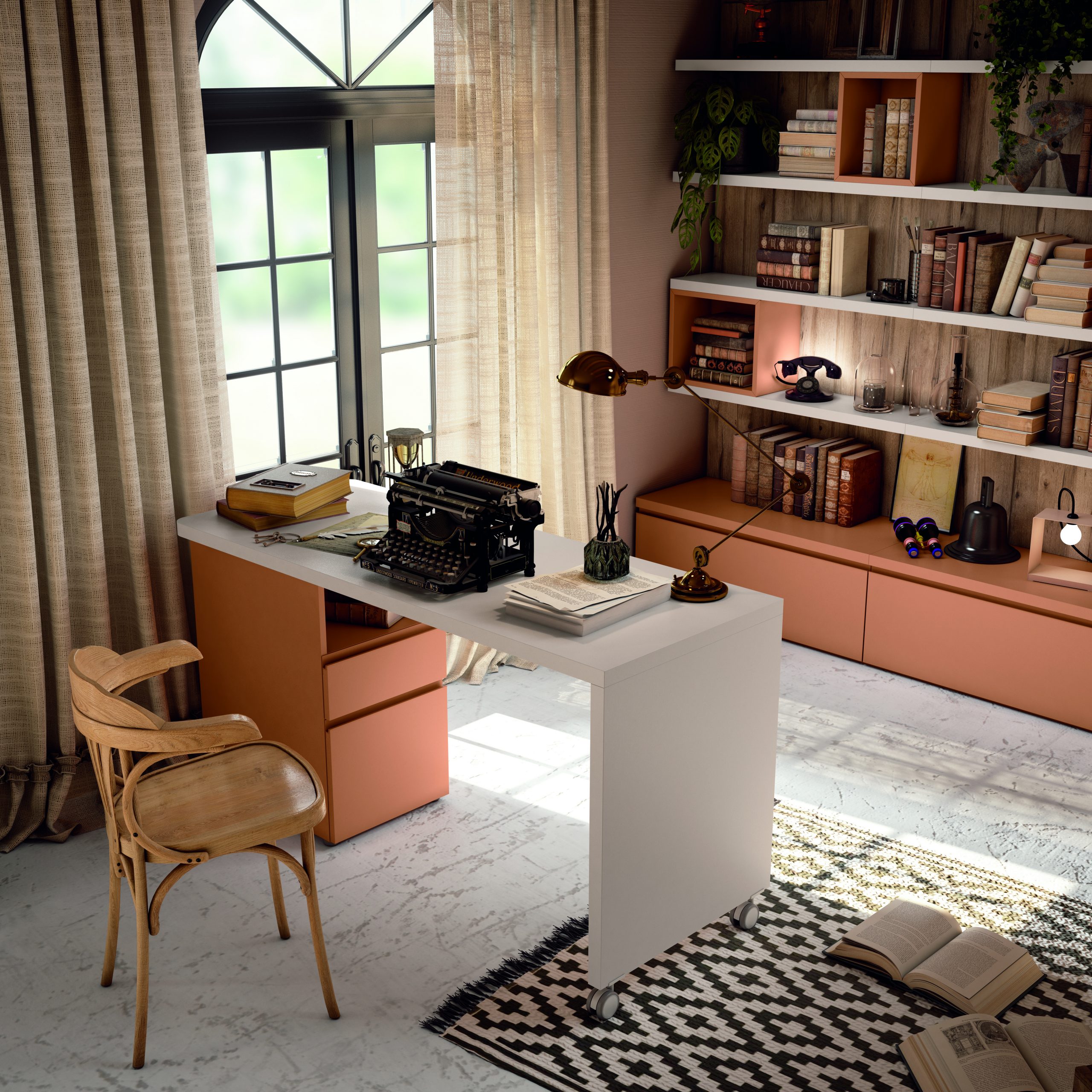 Además, incorpora una mesa giratoria con módulo integrado, una solución versátil que permite disponer de una superficie de trabajo cuando se necesita y liberarla fácilmente cuando no se utiliza. Esta pieza se adapta a diferentes configuraciones, optimizando el espacio y facilitando el orden diario.