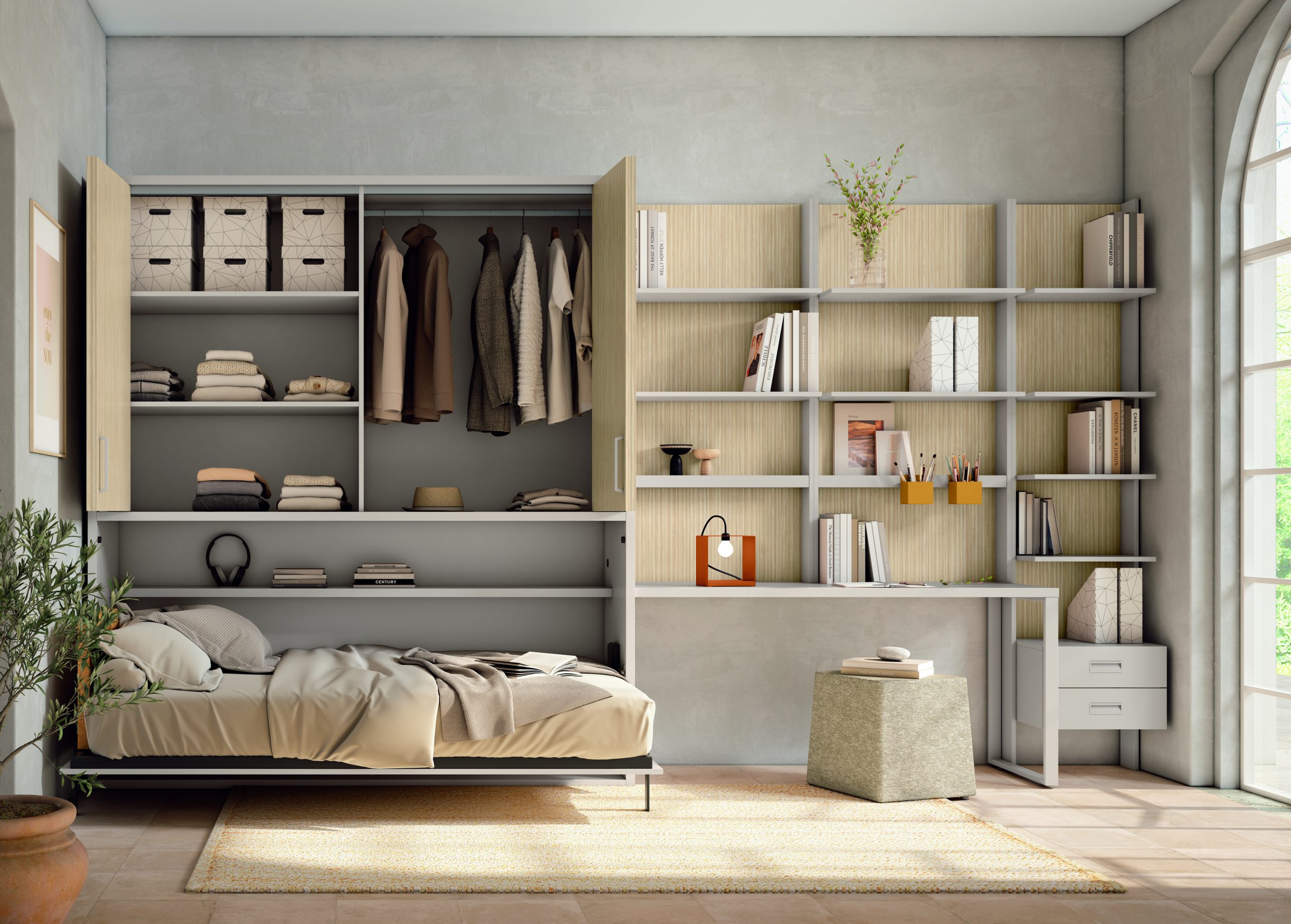 El conjunto está formado por una cama horizontal con armario de puertas plegables (fondo 59 cm, altura 237,8 cm). Esta solución abatible permite mantener el orden en habitaciones reducidas, proporcionando un espacio de descanso cómodo y práctico sin sacrificar superficie durante el día.