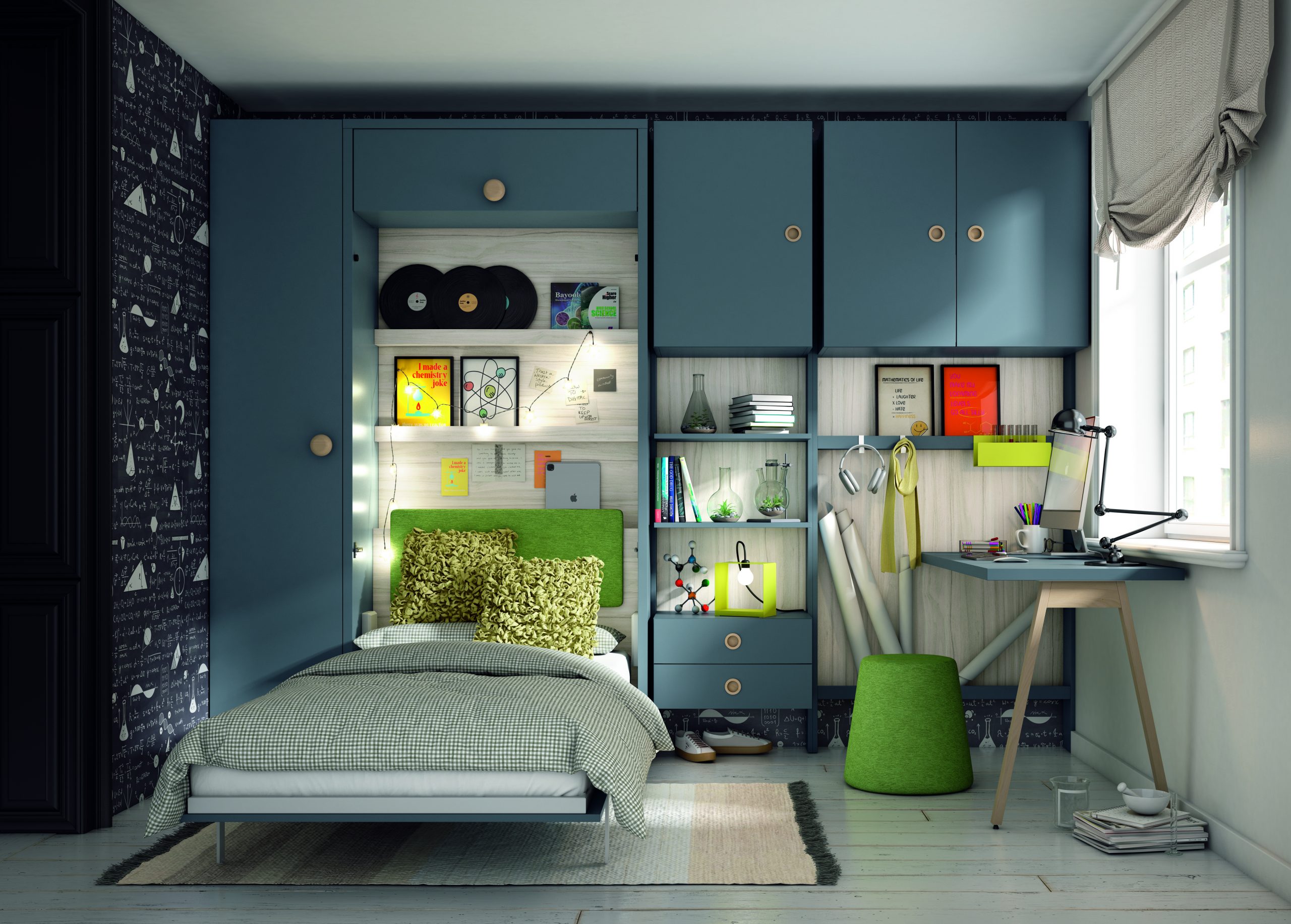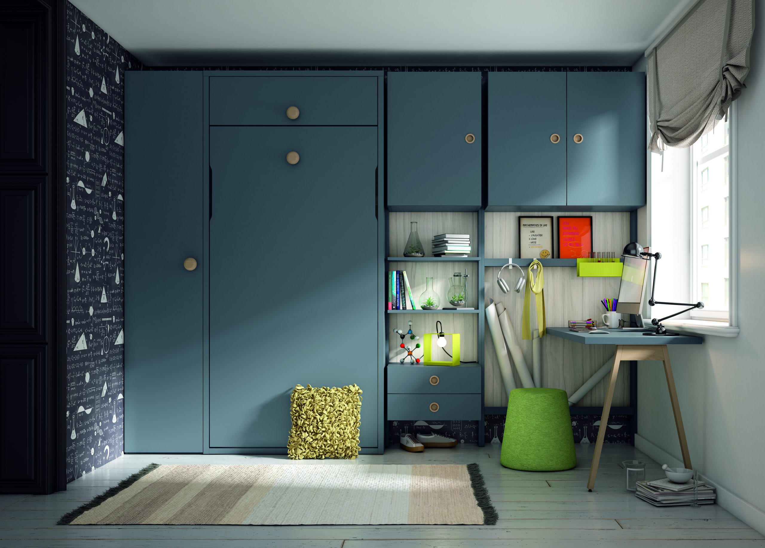 El conjunto incluye una cama vertical con altillo (fondo 43 cm, altura 237,8 cm, 190 × 90 cm), que permite combinar descanso y almacenaje en un mismo módulo. Su sistema abatible facilita la organización del espacio, ofreciendo una habitación ordenada y multifuncional.