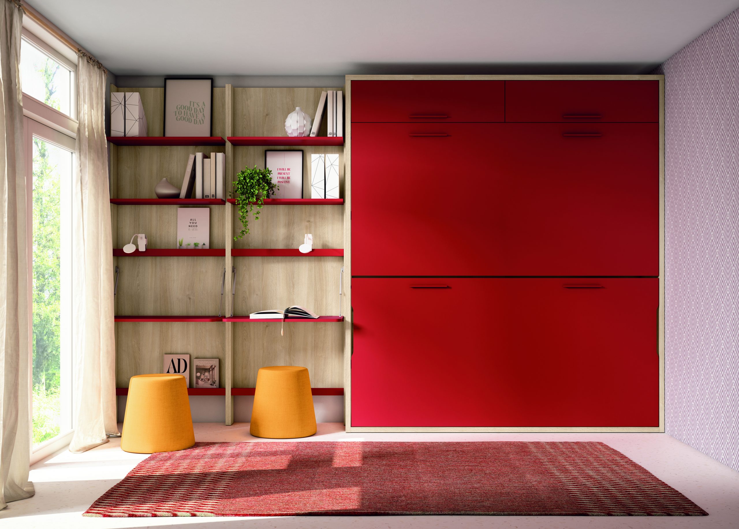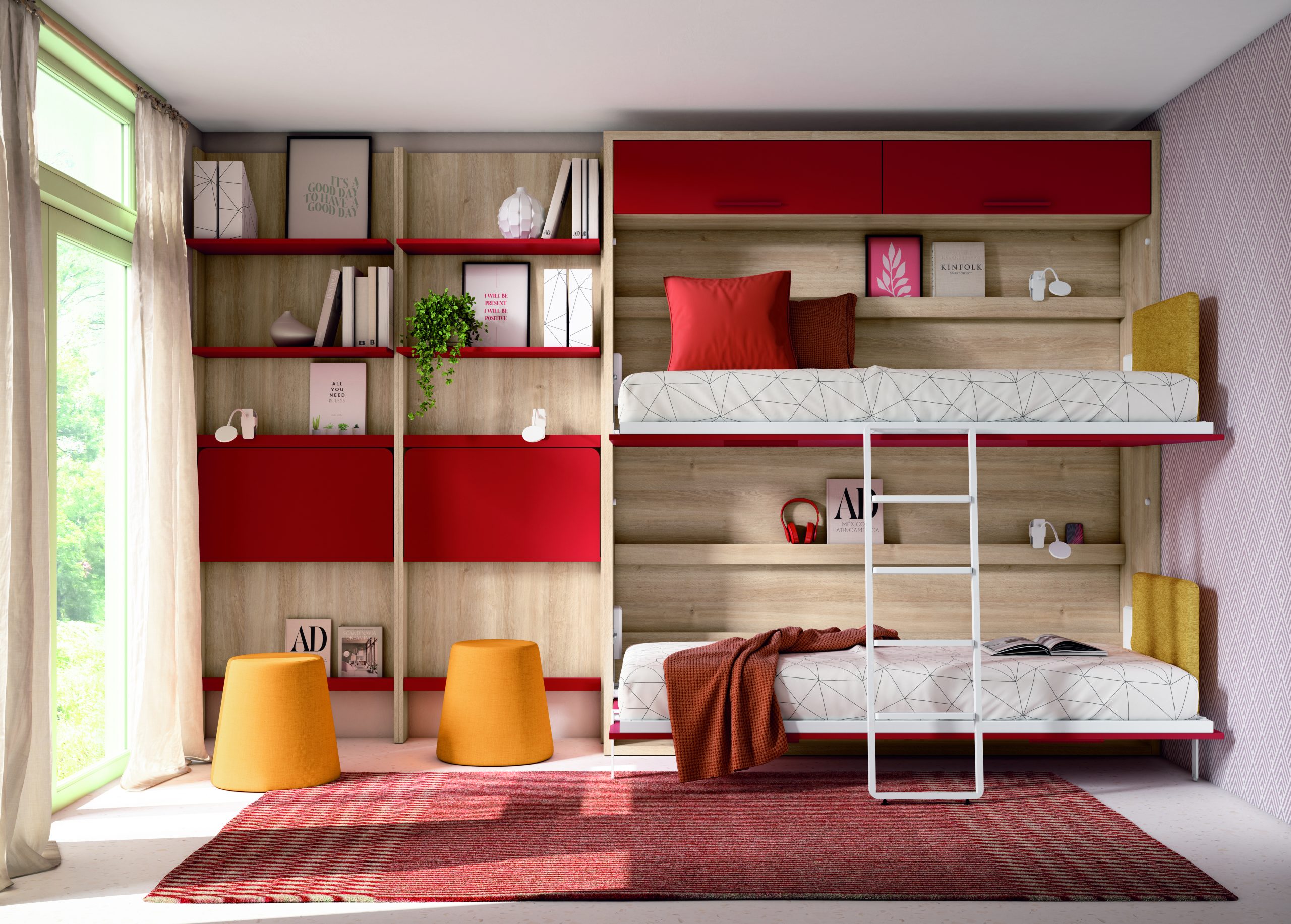 El conjunto incluye una litera cama horizontal doble con altillo (fondo 43 cm, altura 237,8 cm, 190 × 90 cm). Esta estructura abatible permite aprovechar el espacio vertical, ofreciendo una solución práctica y cómoda para dormitorios compartidos o de dimensiones reducidas.