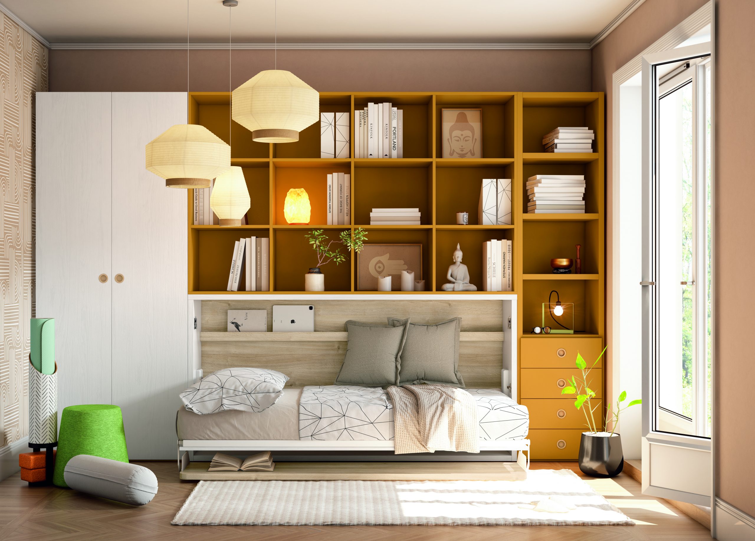 En conclusión, el dormitorio juvenil Ros Delulu 69 es una solución práctica, cálida y elegante. Su cama abatible con mesa, armario y estanterías crean un espacio funcional y ordenado sin renunciar al diseño.