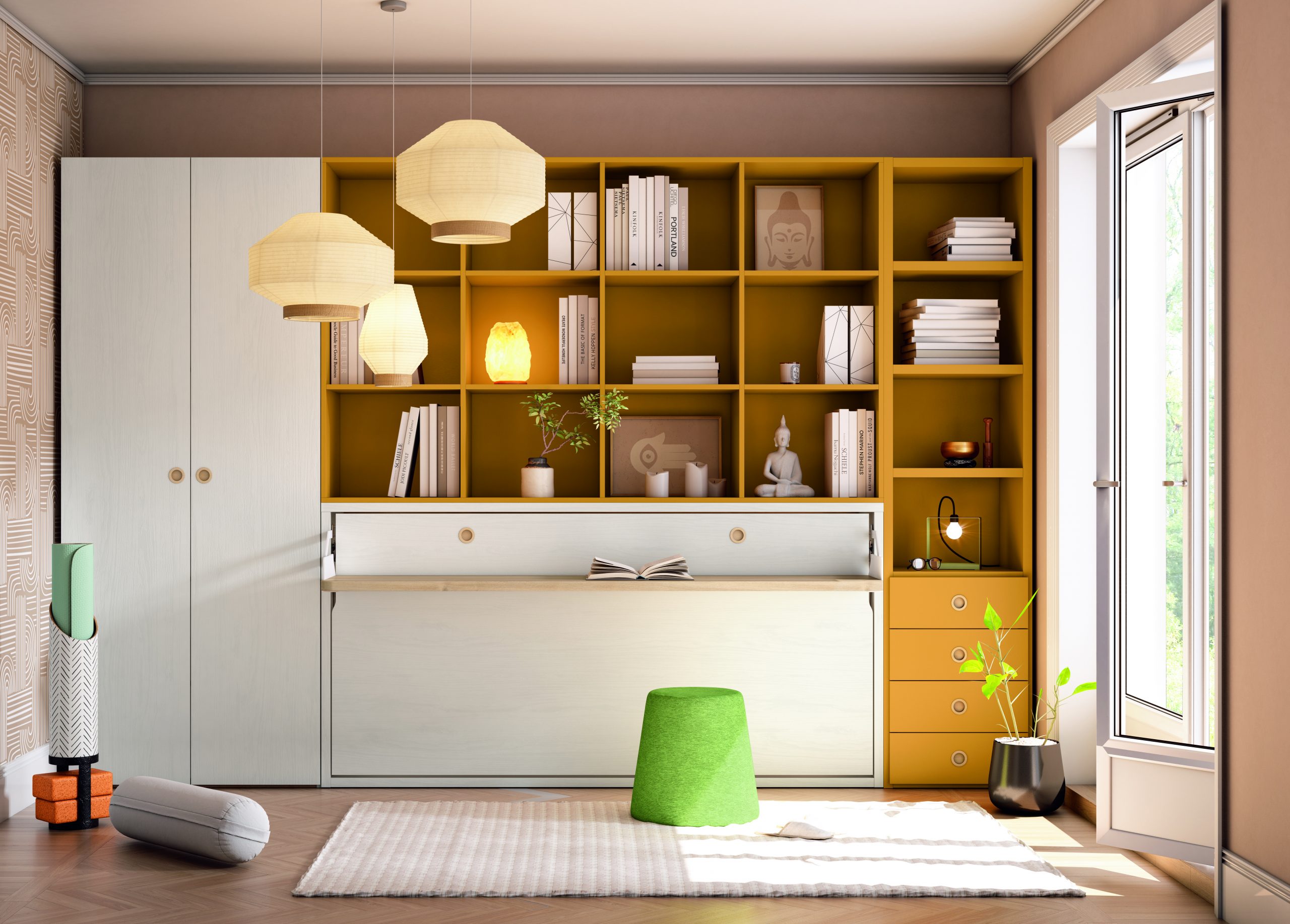 También incorpora un puff cónico tapizado, cómodo y versátil, que añade un toque de color y confort al espacio. Además, los accesorios cubrepistón permiten mantener un acabado limpio y estético en la estructura abatible.
