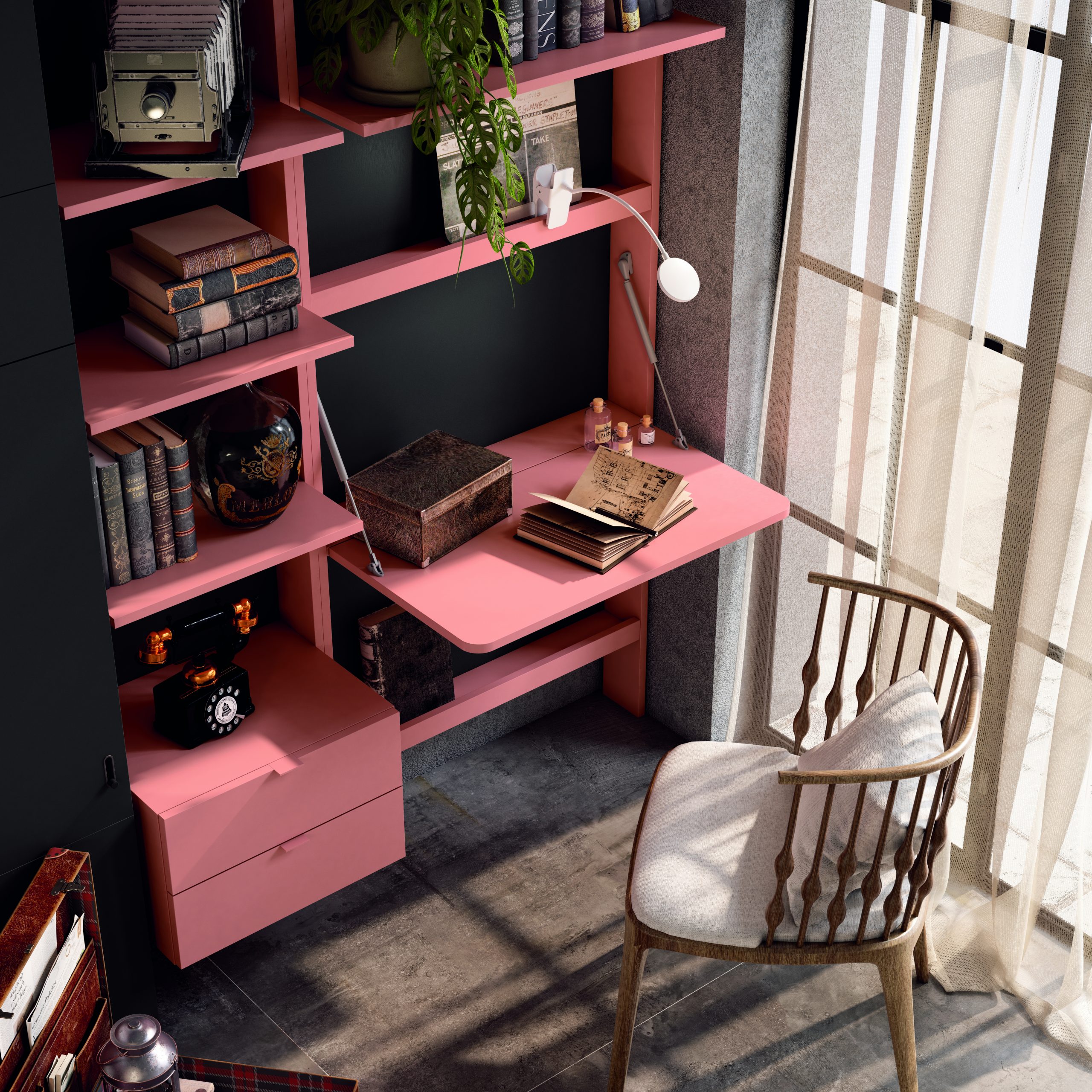 La estructura modular del dormitorio juvenil Ros Delulu 71 aprovecha el espacio vertical y facilita la organización. Su cama abatible, escritorio abatible y estanterías modulares convierten este conjunto en una opción versátil y práctica para cualquier habitación juvenil.