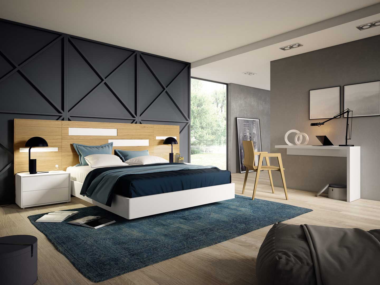El protagonista de esta composición es el cabecero Dance, fabricado en Roble Natural con delicados detalles en Blanco. Con sus medidas de 285 x 120 x 5 cm (60-150-60), se convierte en el punto focal del dormitorio, aportando carácter y sofisticación. Este diseño ofrece un equilibrio perfecto entre la textura cálida de la madera y la luminosidad del color blanco.