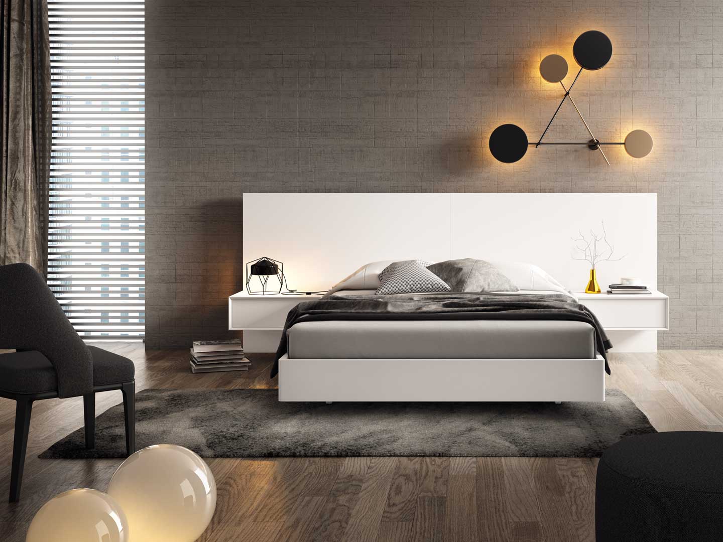 El conjunto está presidido por el cabecero Light, de 285 x 110 x 5 cm (60-150-60), fabricado con líneas rectas y un acabado impecable en blanco lacado. Este elemento aporta un equilibrio visual que realza la pureza del dormitorio, convirtiéndose en el punto focal de la estancia.