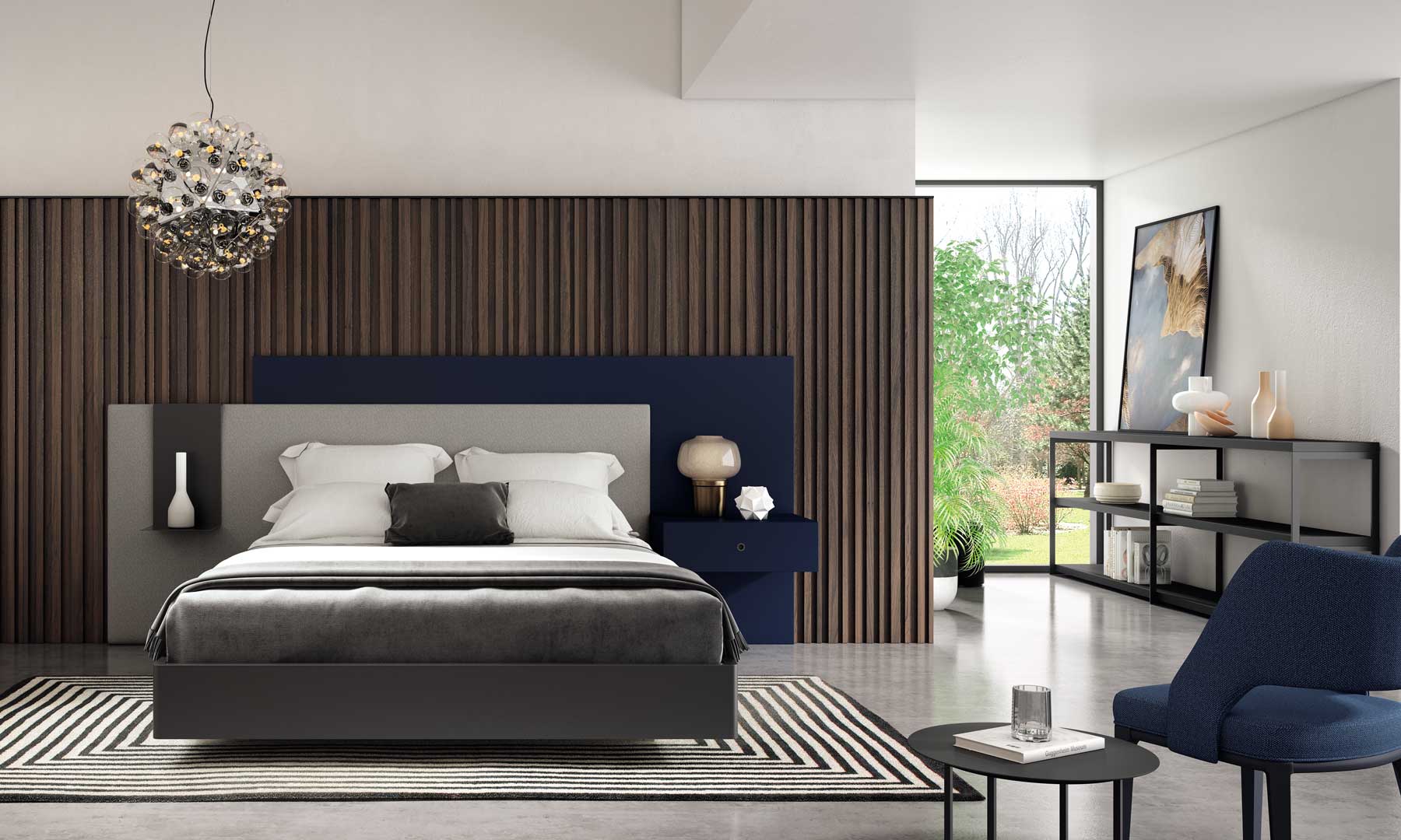 El Dormitorio NICHT.BOC.IN043 destaca por su estilo moderno y lleno de carácter. Su combinación de Azul Náutico, Grafito y Teide crea un ambiente sofisticado, equilibrado y con un toque distintivo.