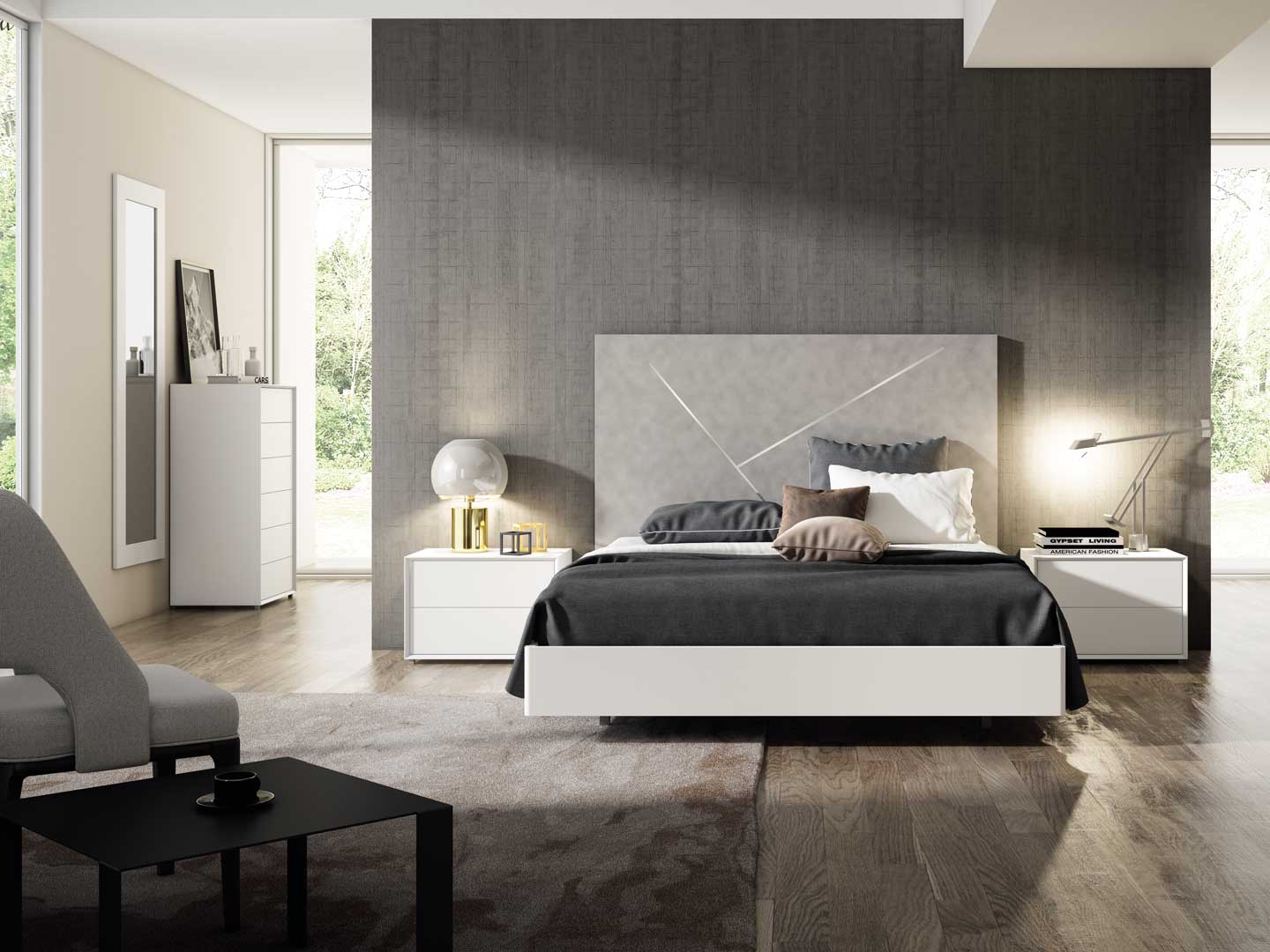 El conjunto está encabezado por el cabecero Mínimal, fabricado en folding, con un diseño de líneas puras y un acabado refinado en Gris Caliza con detalles inox. Mide 165 x 110 x 5 cm (150) e incluye un suplemento de altura de +20 cm, lo que realza su presencia y aporta un aire más majestuoso al dormitorio.