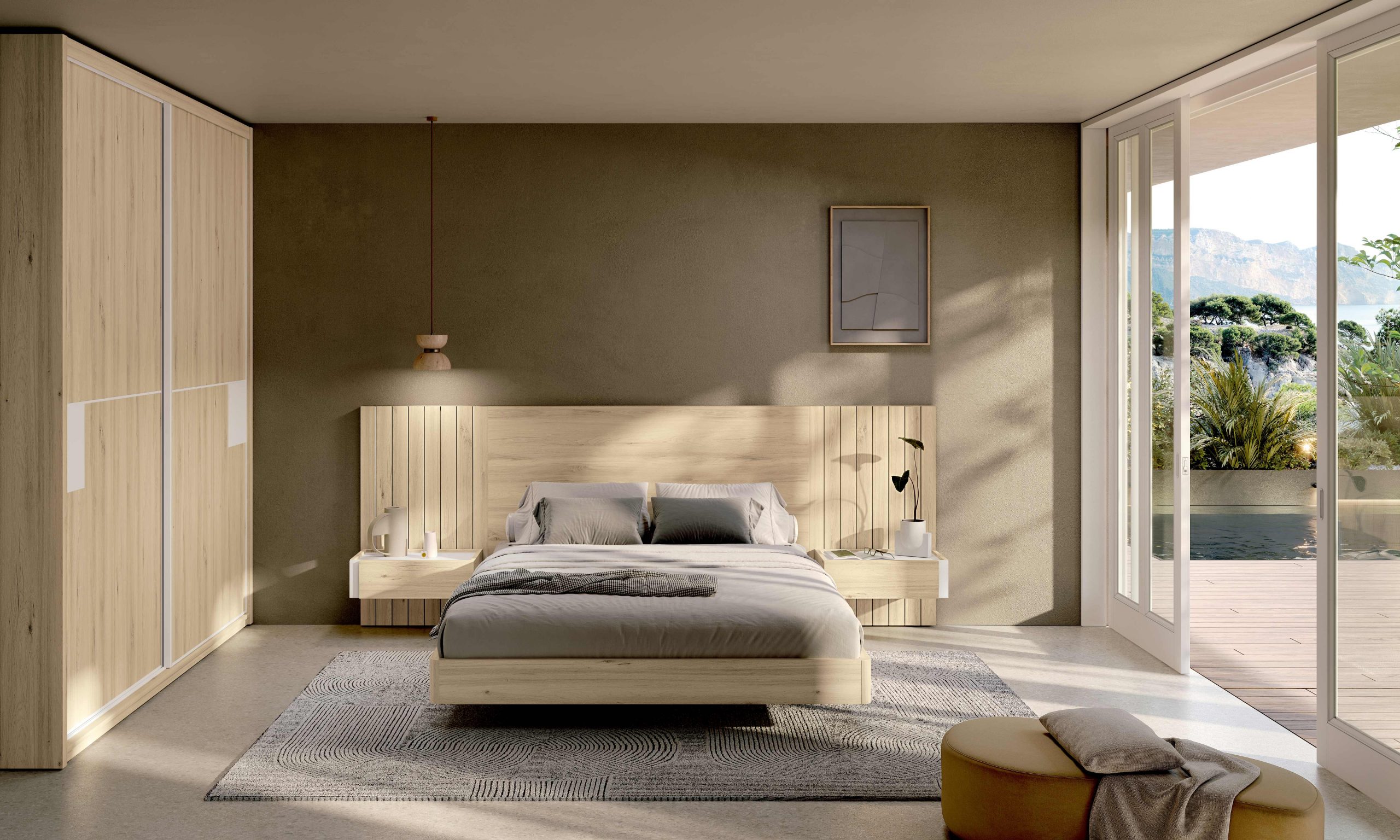 Dormitorio con alas alistonadas, sencillo y moderno.