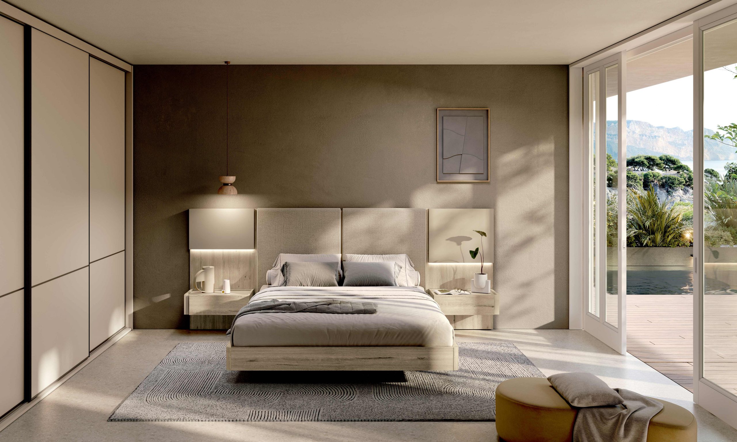 Dormitorio con cabecero tapizado, máximo confort en tu descanso diario.
