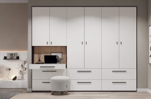 Armario cerrado con puertas y cajones de gran capacidad, donde además podemos incorporar una práctica mesa extraíble. Las conexiones quedan escondidas detrás de la trasera.