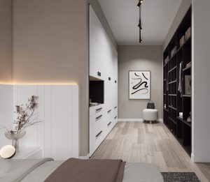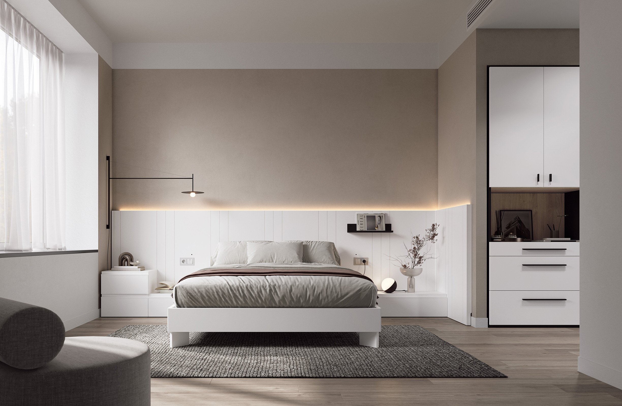 diseños atemporales, apuesta por un cabecero en tono Blanco con unas finas líneas en tono