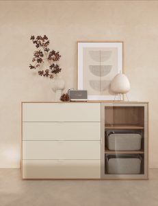 Cómoda Natur de 4 cajones y puerta vitrina con forrado perimetral de 1 cm de grosor.