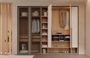 Detalle abierto y cerrado del nuevo tirador Beta de 99 cm de altura. Con el nuevo programa de armarios puedes combinar armarios con puertas de vitrina, armarios con puertas de madera