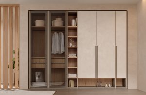 Detalle abierto y cerrado del nuevo tirador Beta de 99 cm de altura. Con el nuevo programa de armarios puedes combinar armarios con puertas de vitrina, armarios con puertas de madera