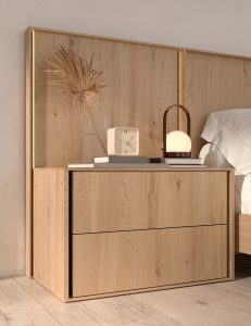 Mantenemos la estética vertical del cabecero Persia 80 combinándolo con mesitas Tempo y bañera de madera con estructura metálica.