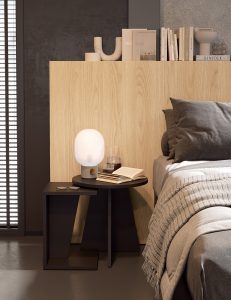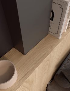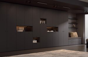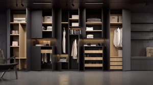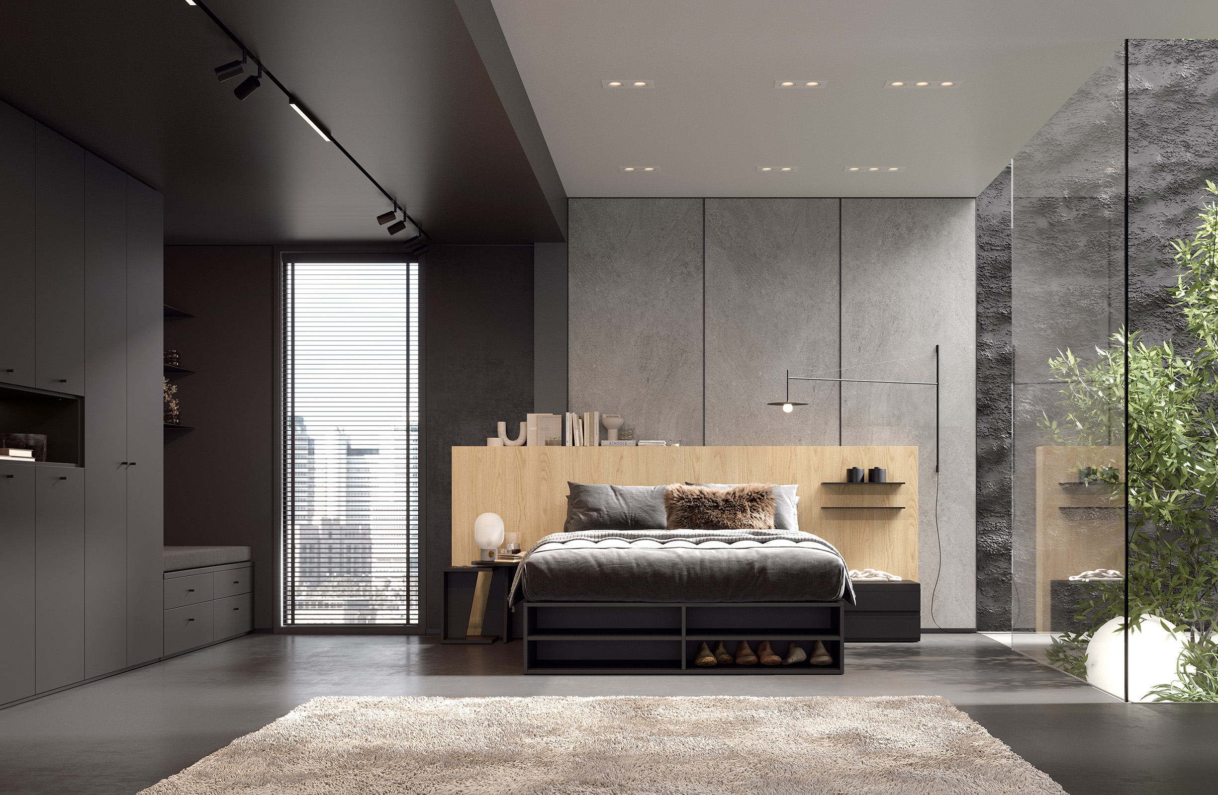 Composición de dormitorio principal completo, frontal de cama con canapé con cajones y zona de armario vestidor amplio y funcional.