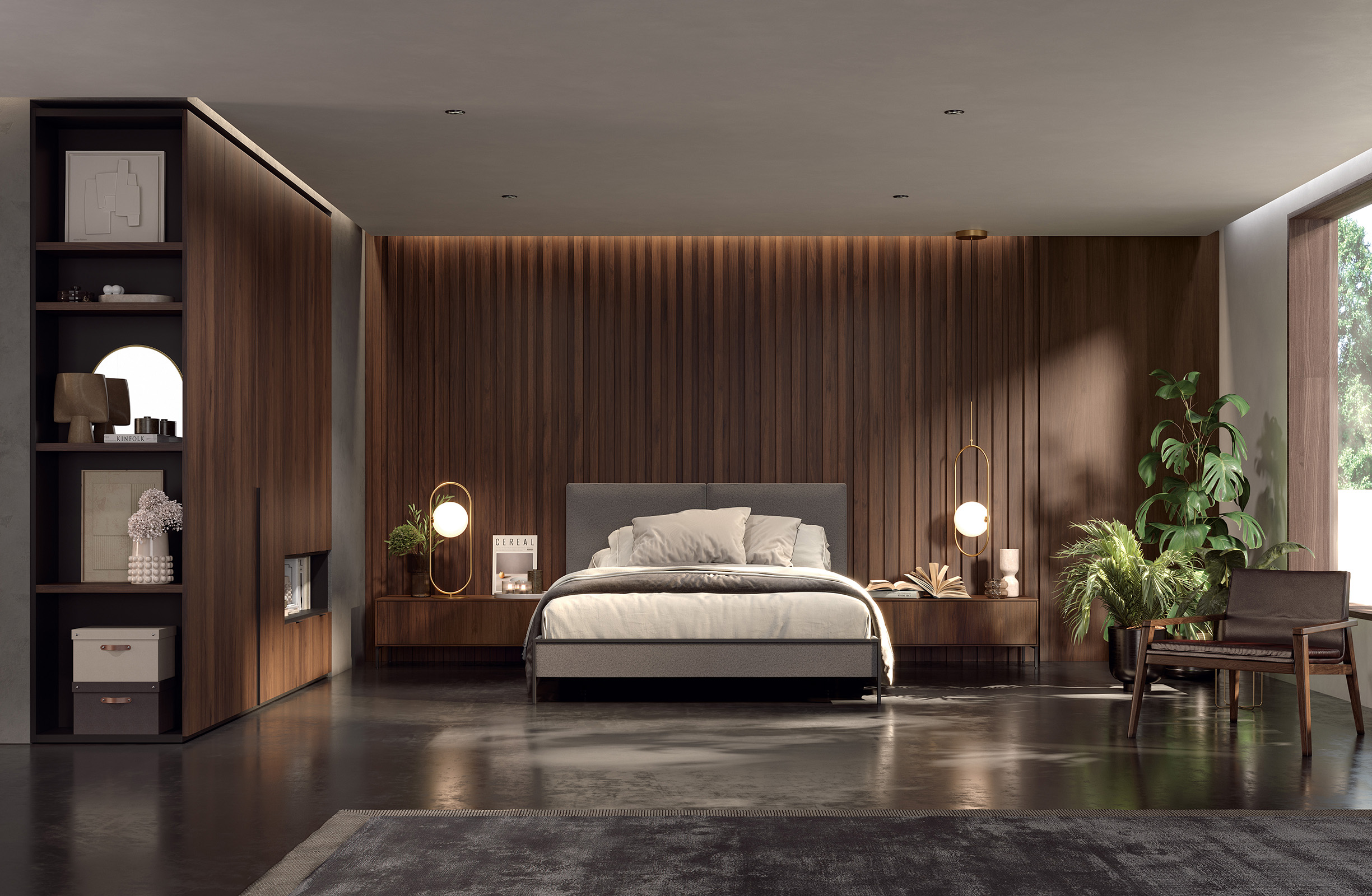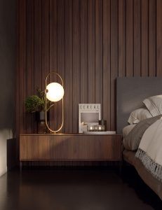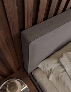 Detalle del cabecero Tapizado Duo delante del panelado Ribbon.