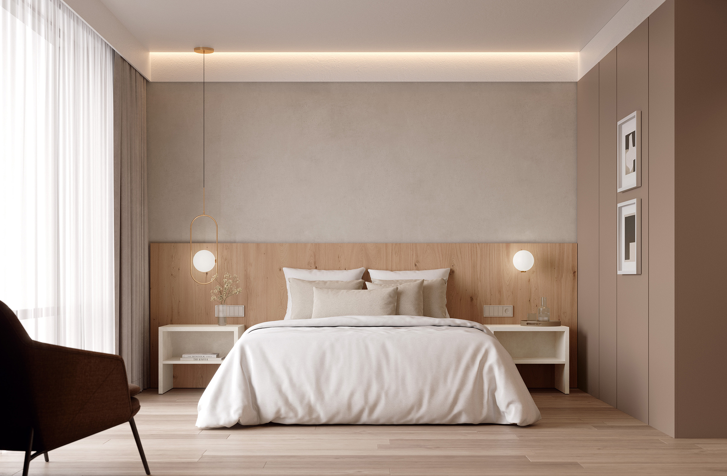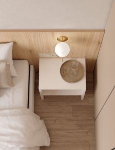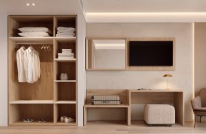 ambiente está formado por un cabecero corrido, un armario abierto, escritorio,
