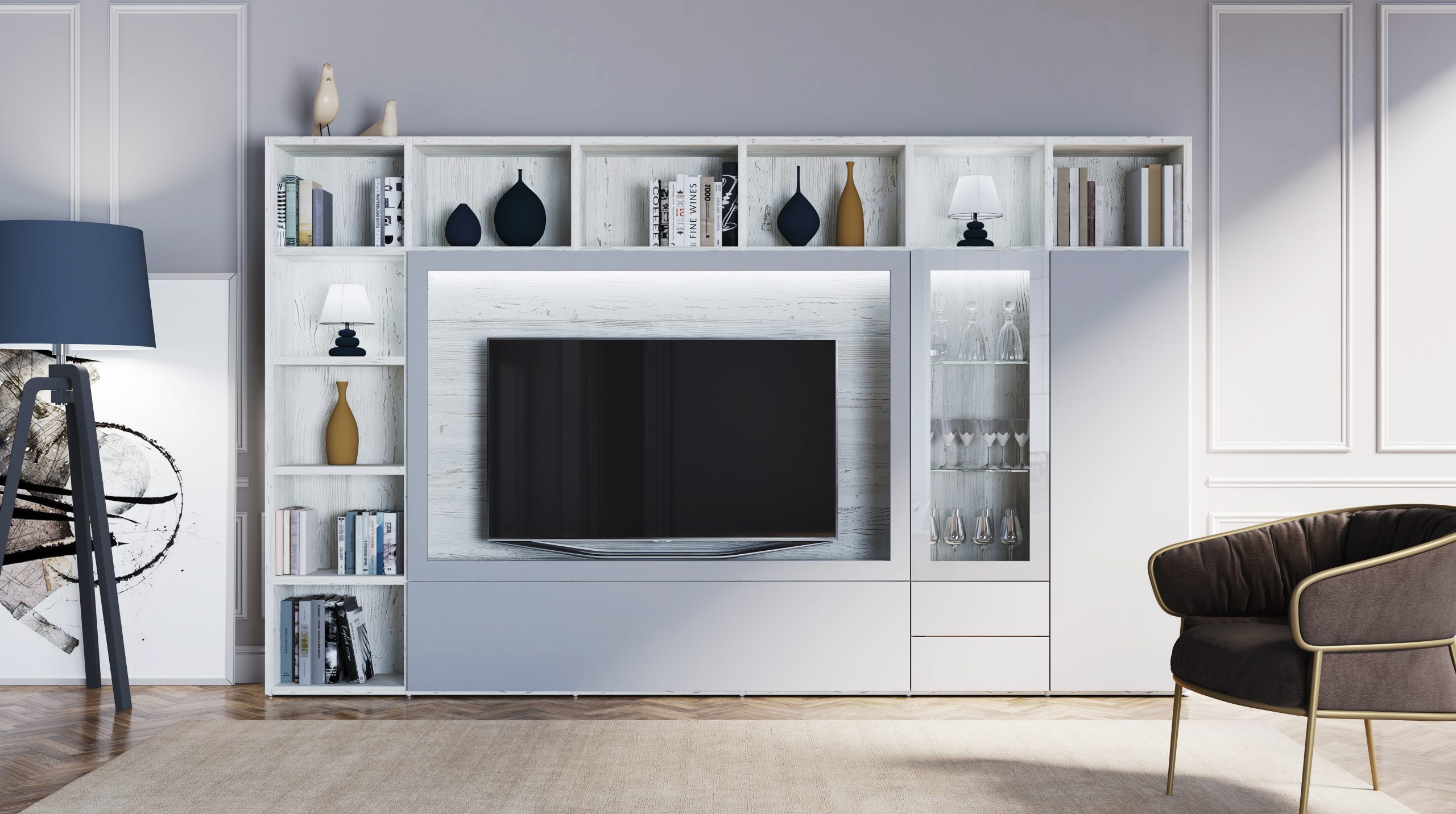 Acabados: lacado color gris nube y laminado blanco rústico.