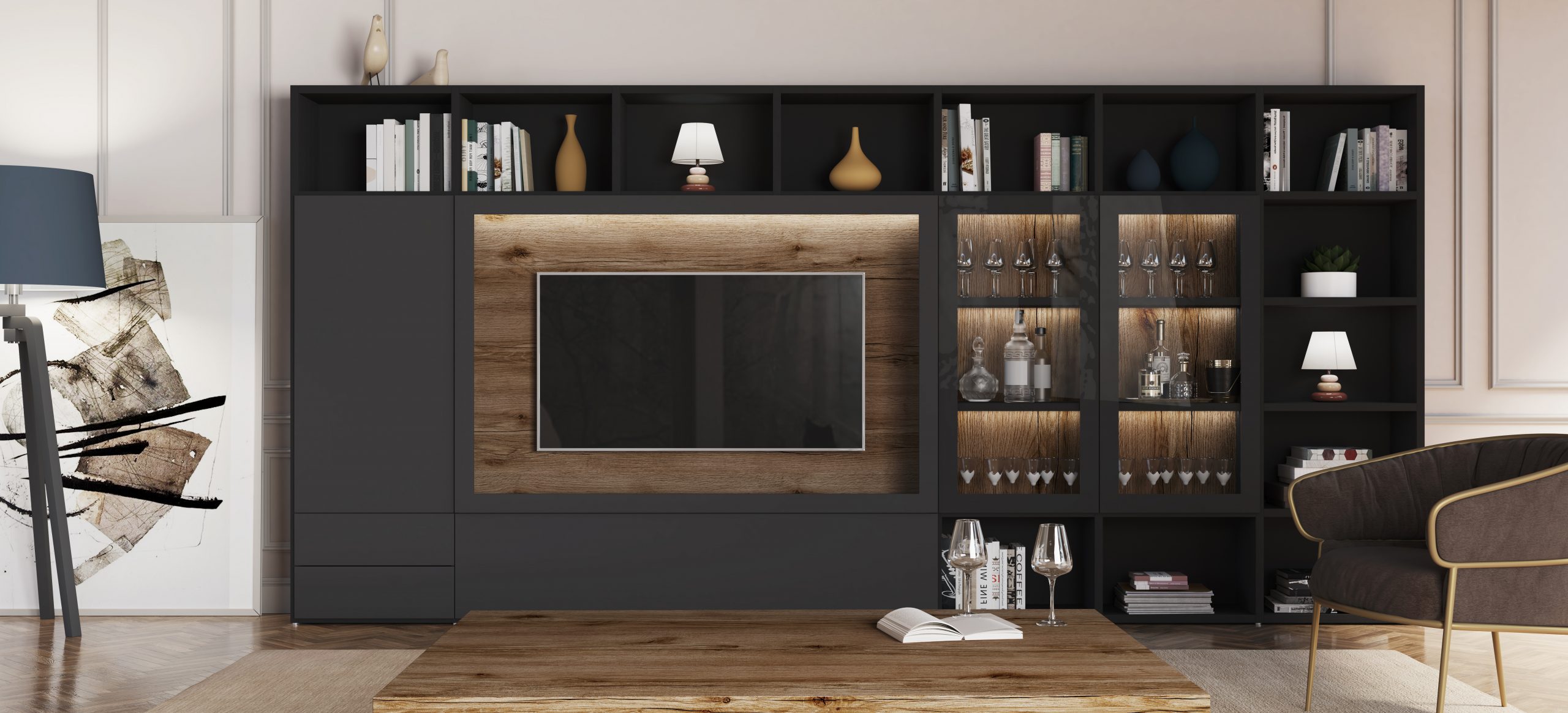 Acabado: Chapado de madera natural de Roble Vintage, lacado color Grafito y laminado madera negra.