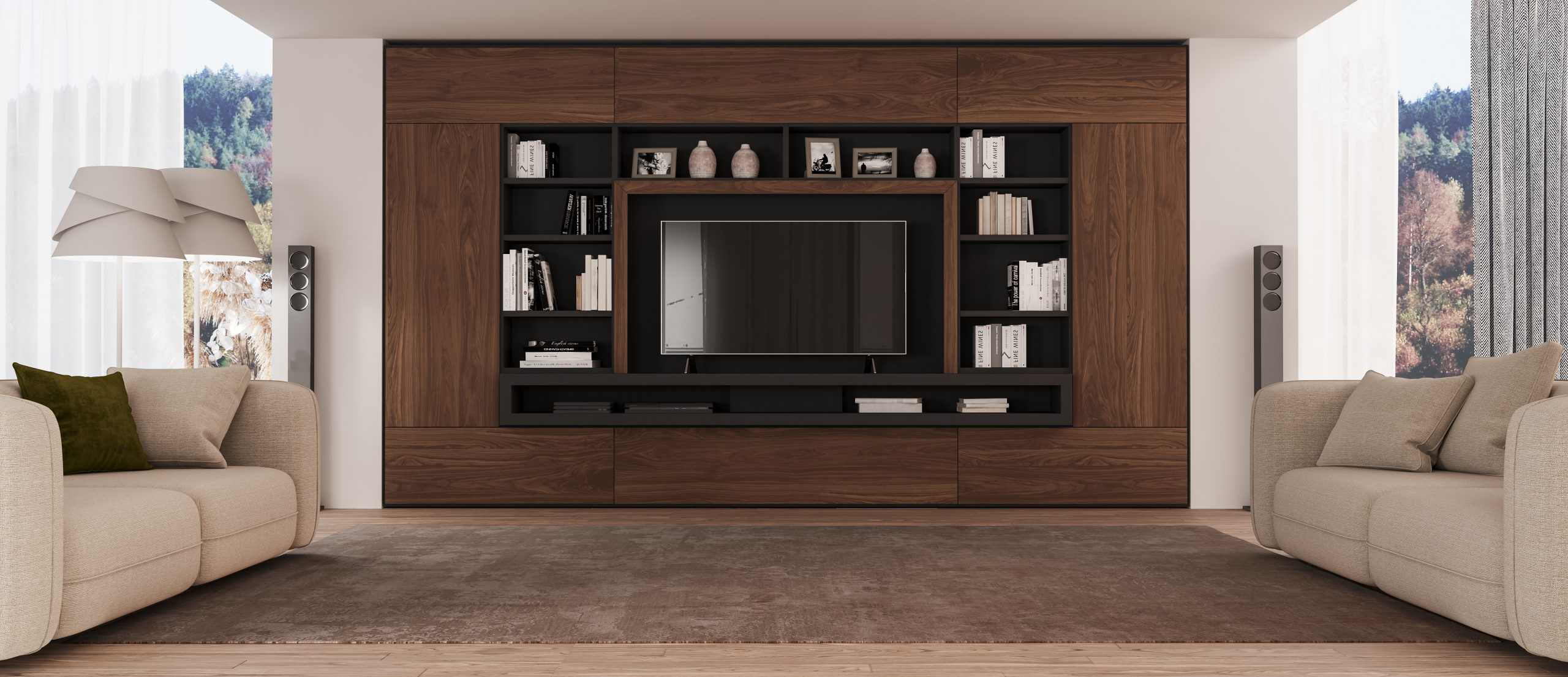 Acabados : Chapado madera natral de Nogal y lacado GRAFITO