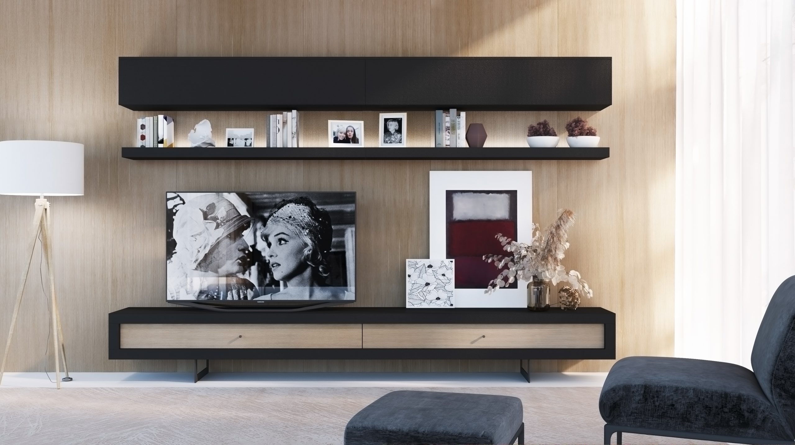 Acabados: Chapado de madera Natural de Roble , laminado madera Negra y patas t.v lacadas en color Grafito.
