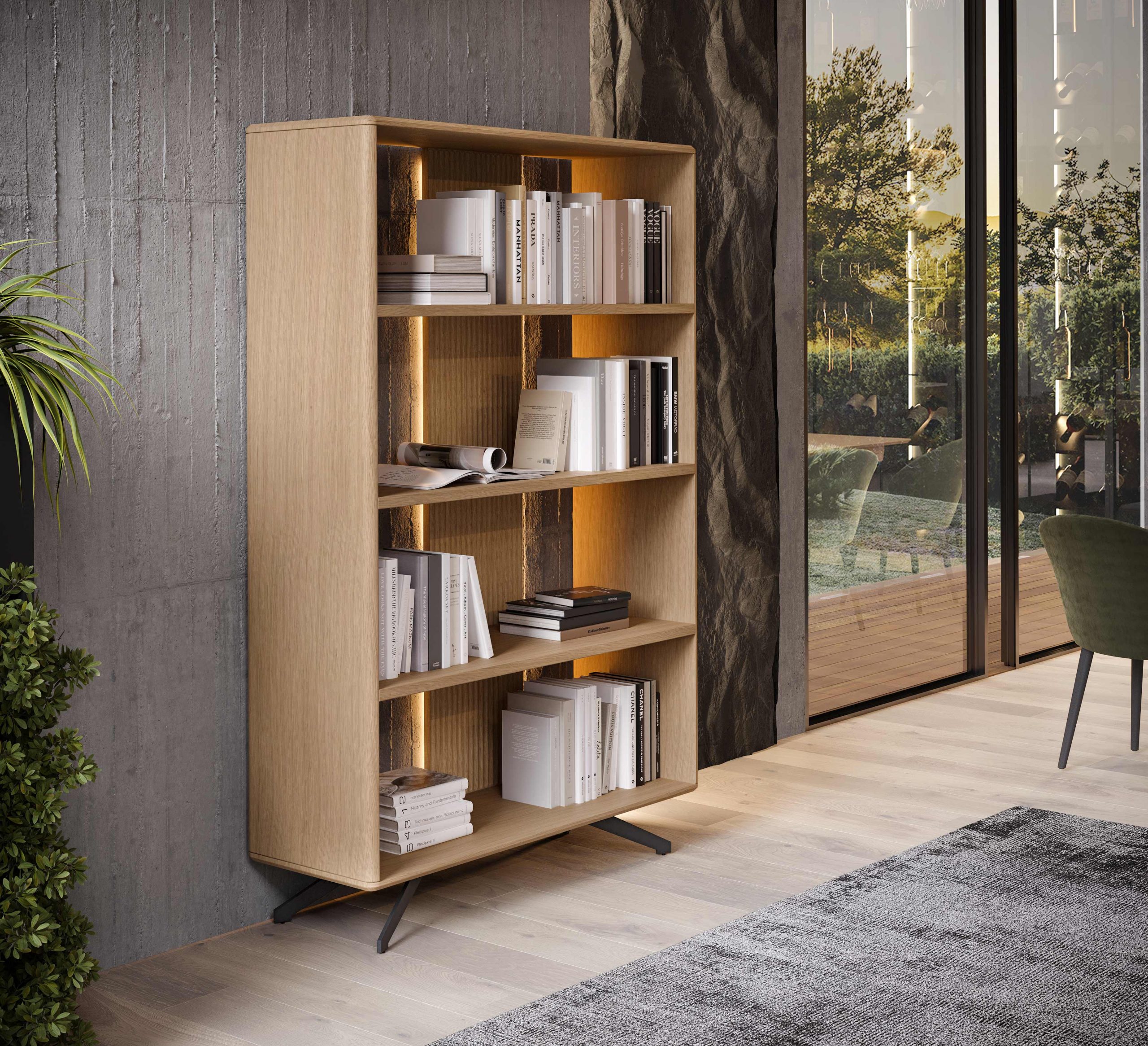 Por un lado, la trasera con forma especial oculta una luz ambiental integrada que aporta calidez y crea un ambiente acogedor. Este detalle convierte a la librería en un punto focal del espacio, ideal para resaltar objetos decorativos o libros. Además, la iluminación indirecta realza la textura natural de la madera y aporta una sensación de confort visual.