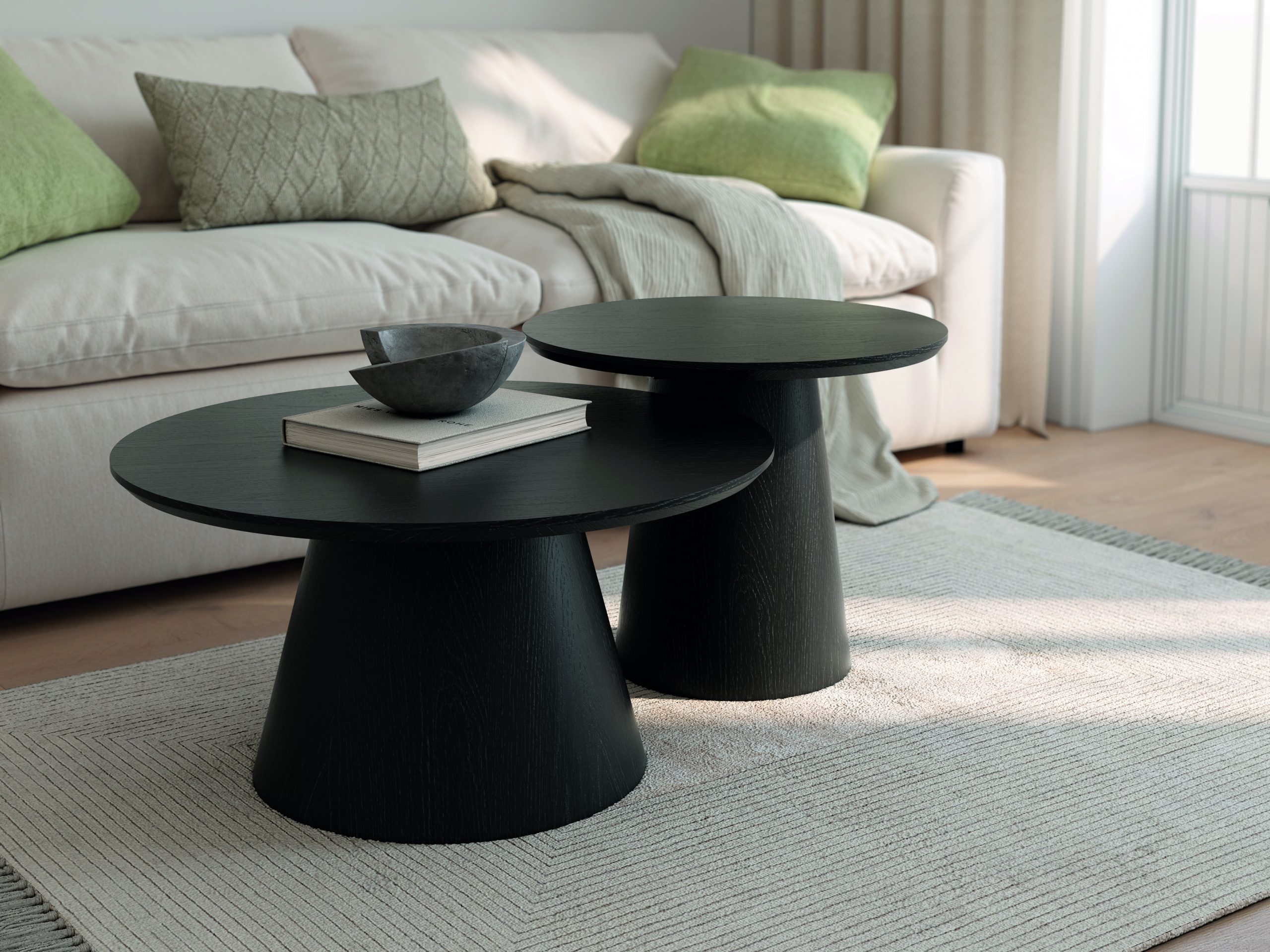 Mesas auxiliares con sobre biselado de 25 mm en acabado madera de roble.