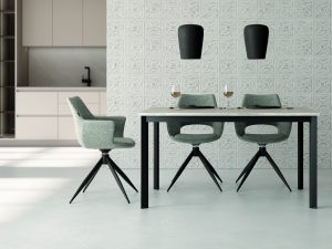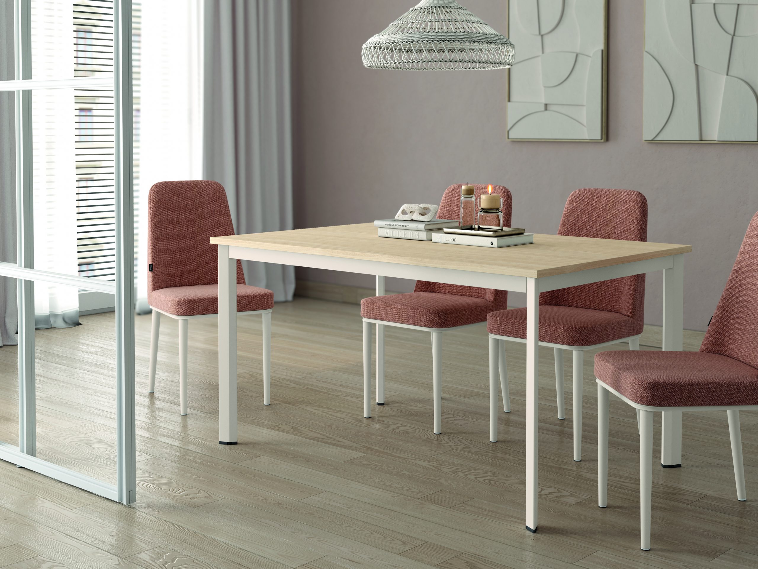 Mesa de comedor fija con estructura metálica marfil o negra.