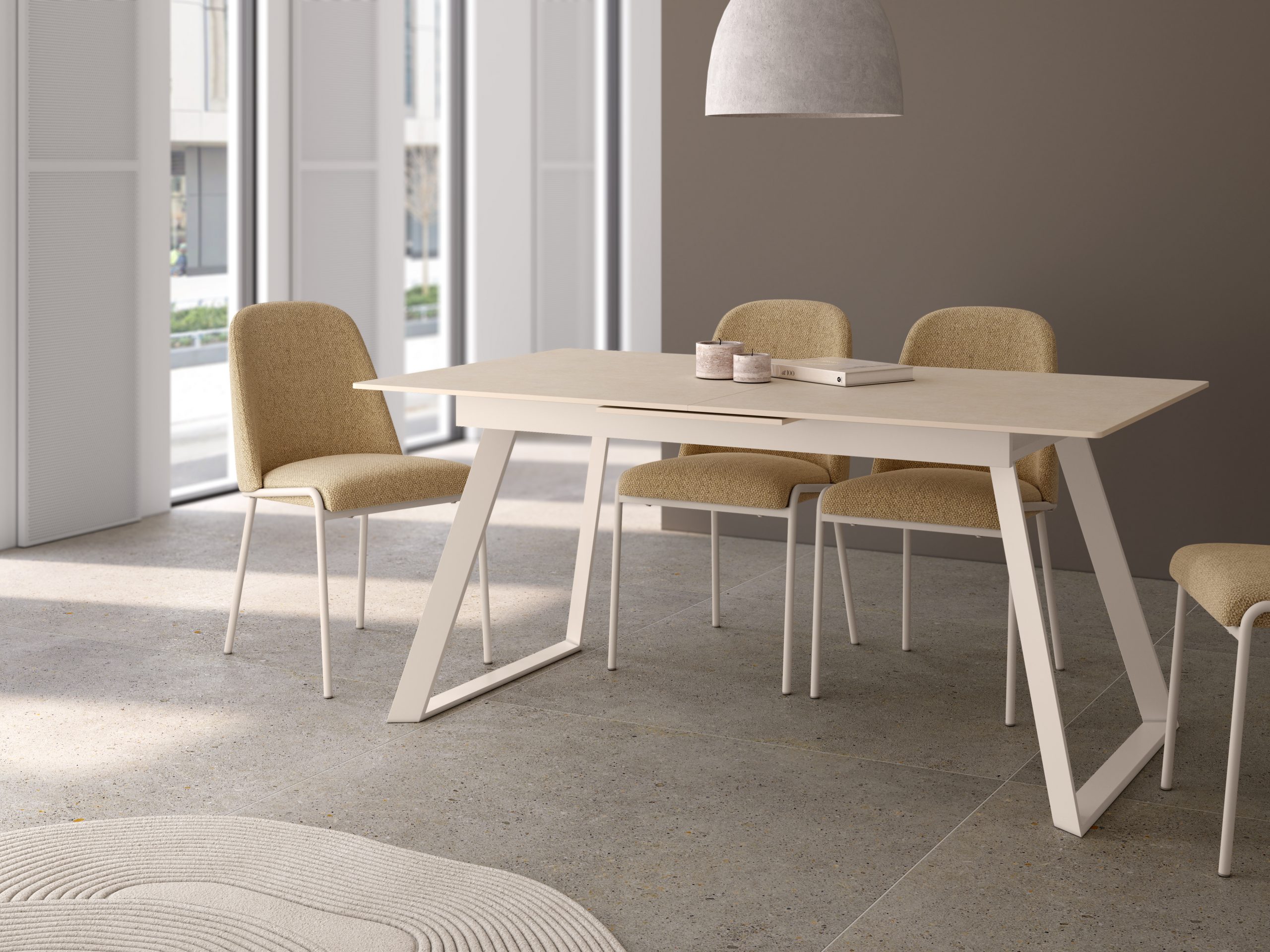 Mesa comedor extensible sincronizada con estructura metálica marfil.