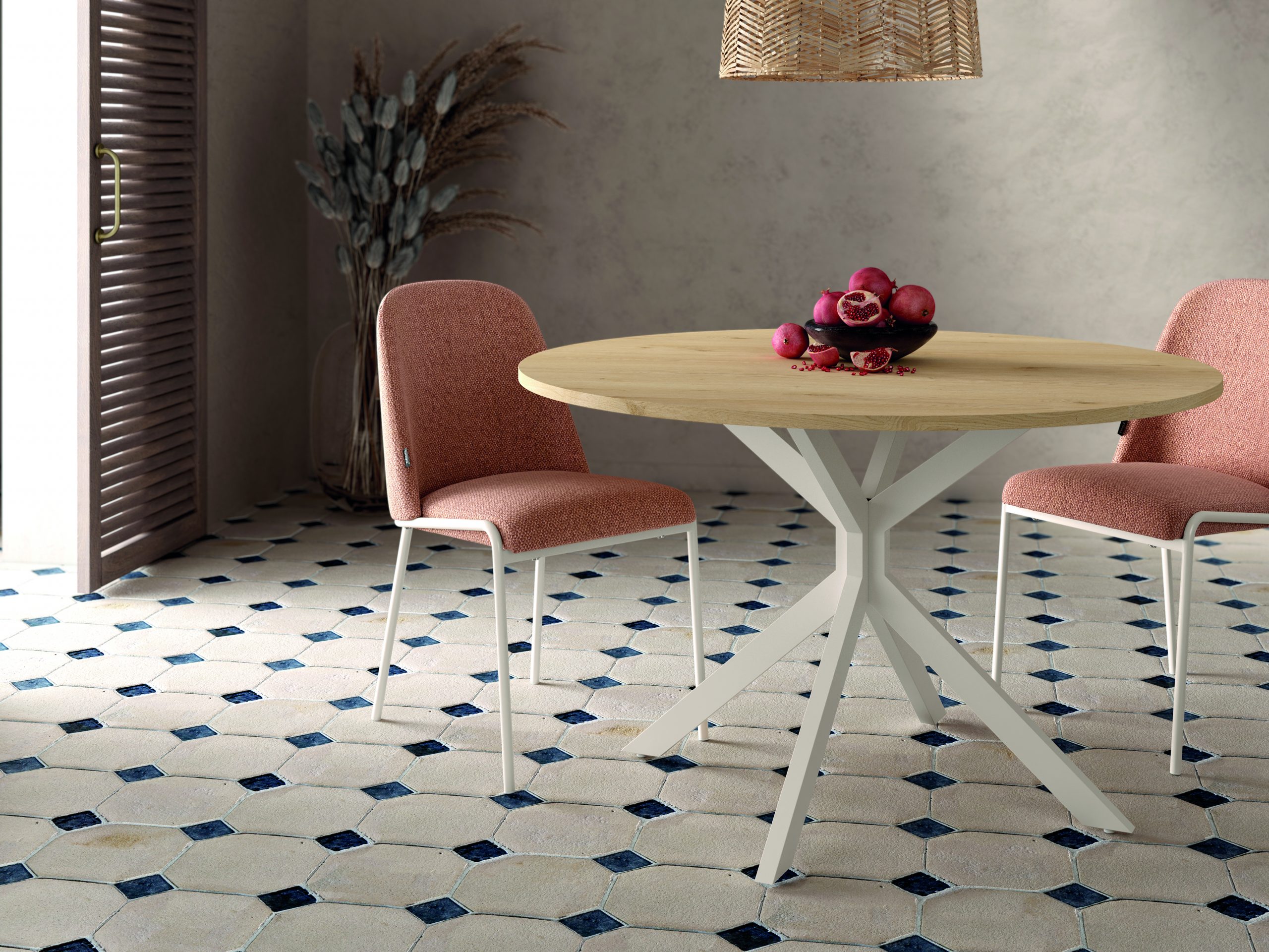 Mesa comedor redonda fija con estructura metálica marfil o negra.