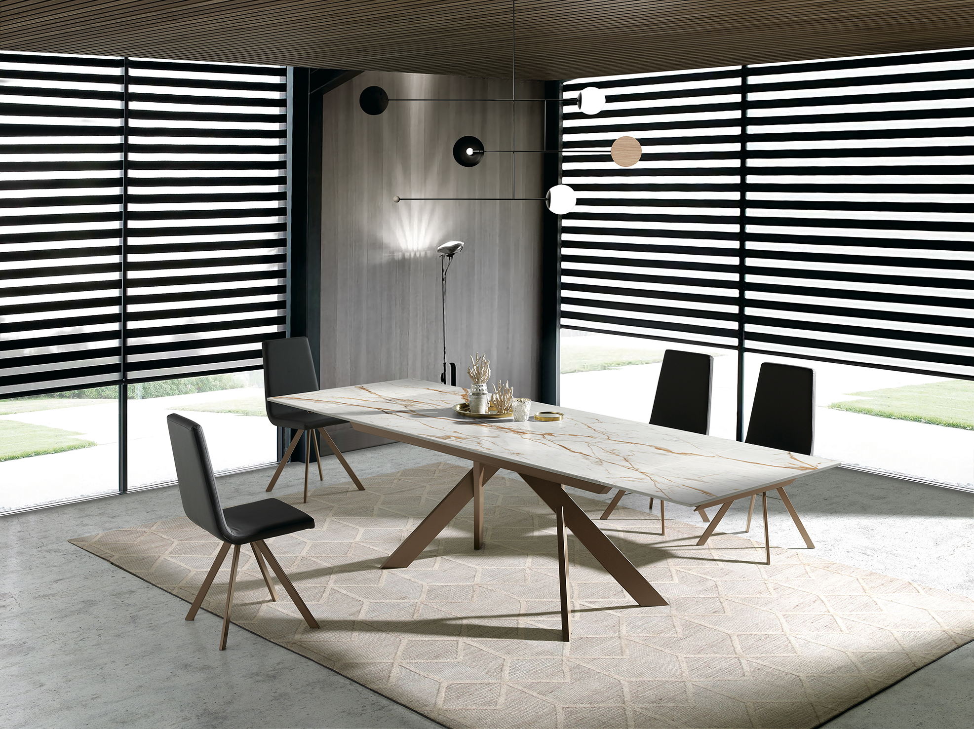Mesa de comedor modelo Kross  con estructura Bronce y tapa Reverie.