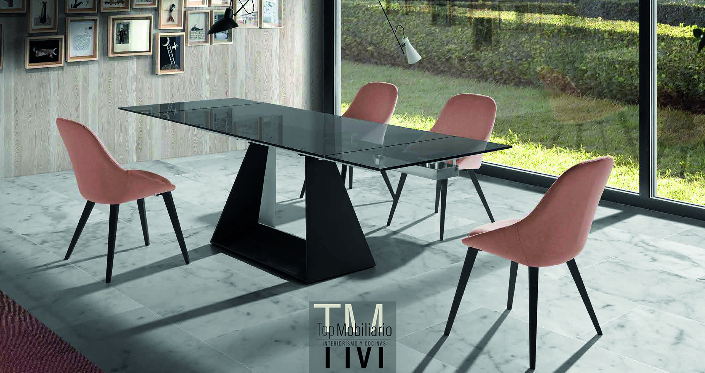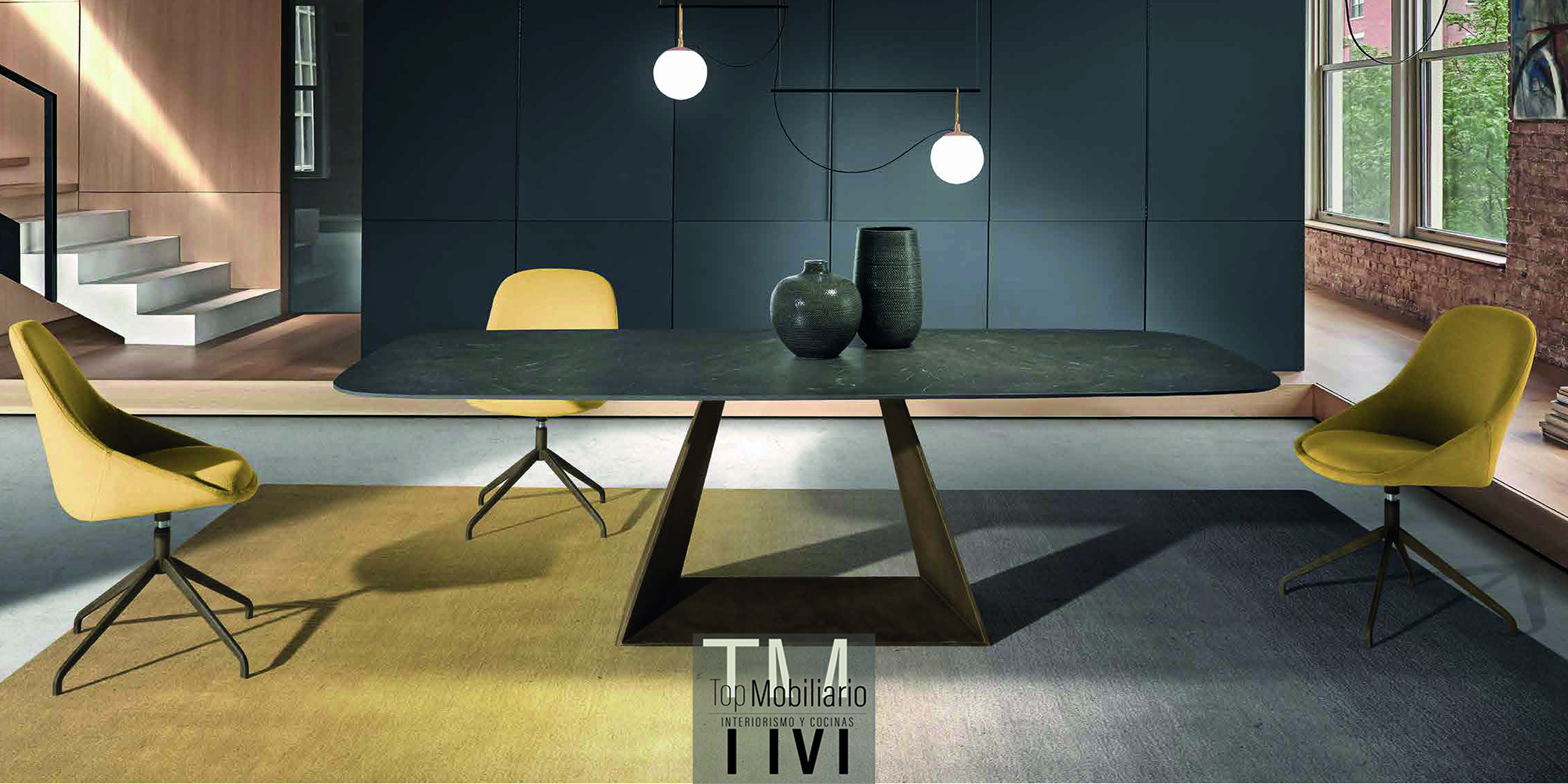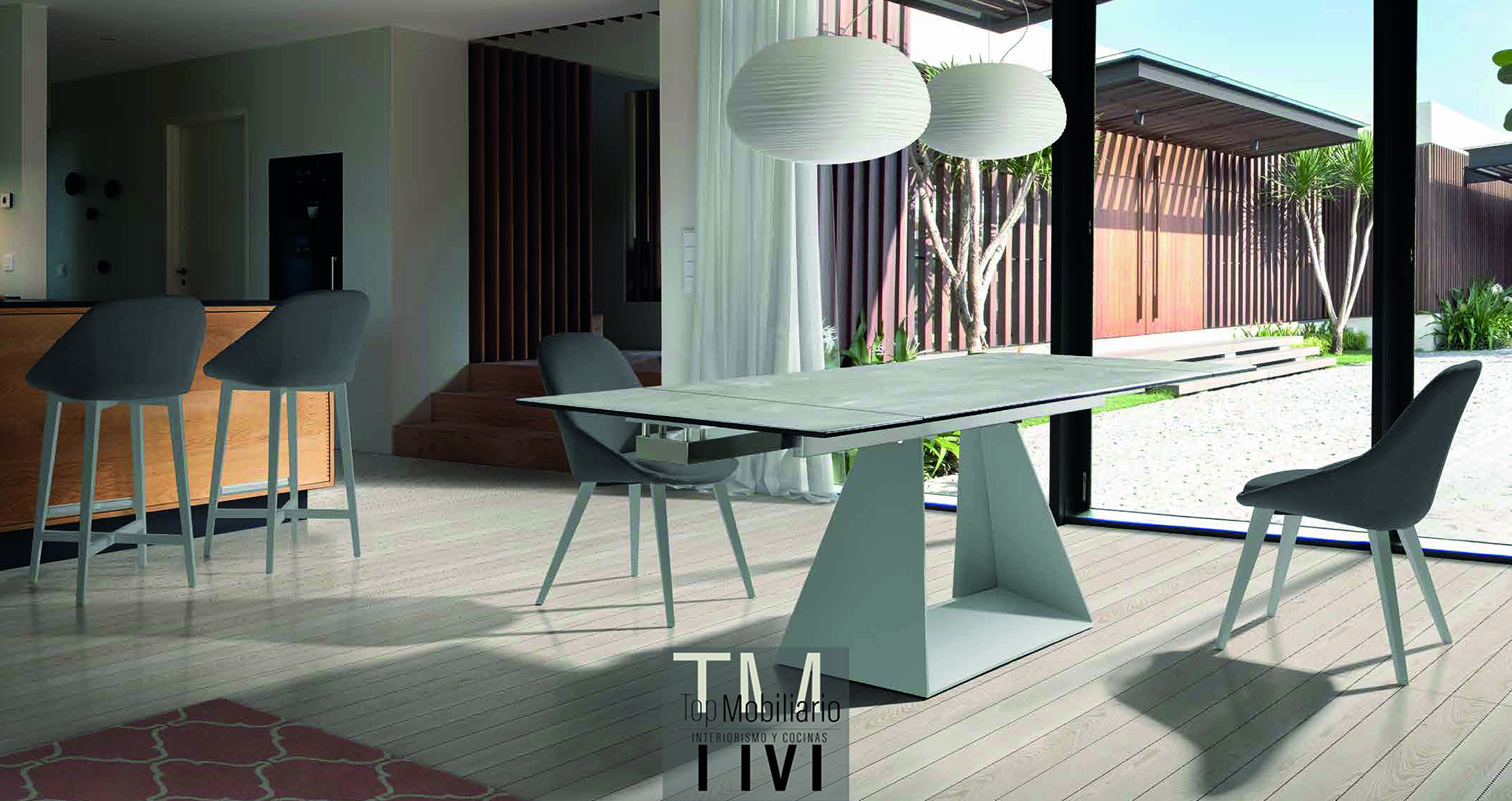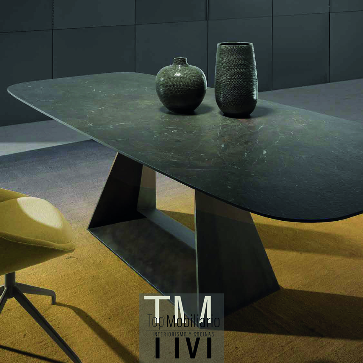 Mesa comedor fija o extensible con tapa cerámica y pata en metal
