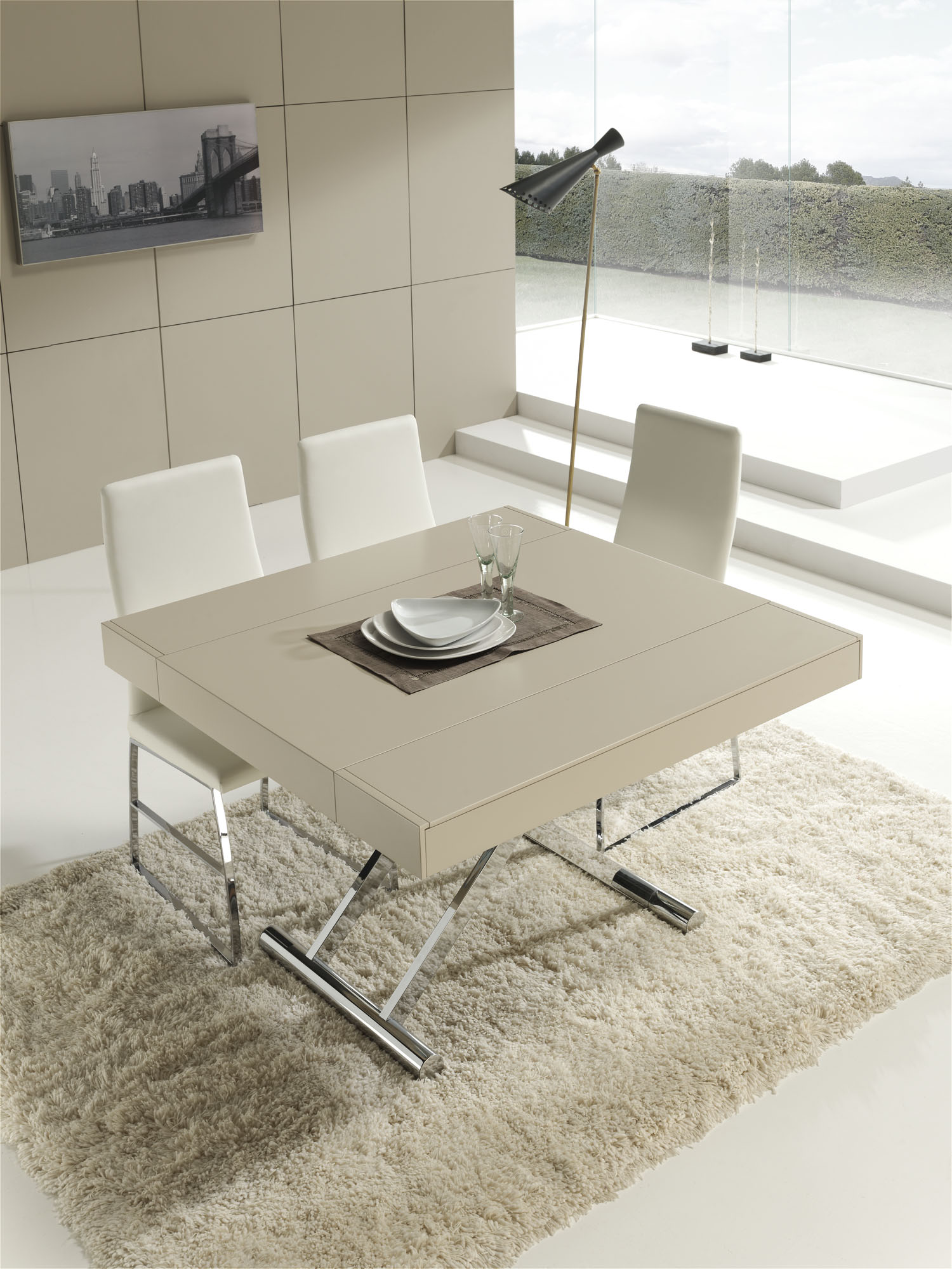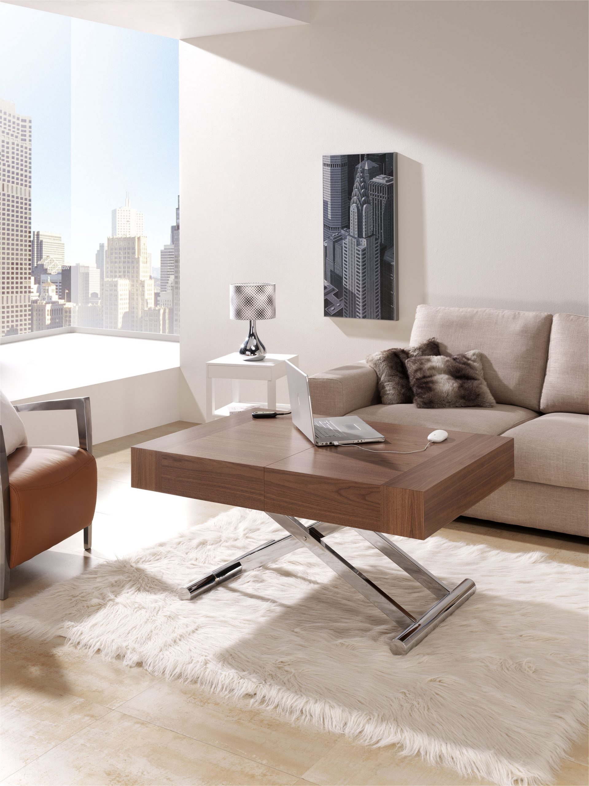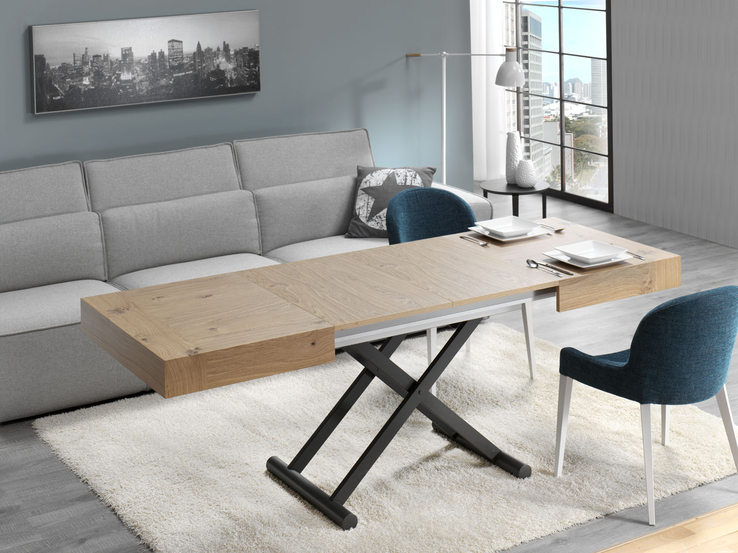 Mesa de centro modelo Activa , con mecanismo extensible y elevador, la mesa de centro que se puede convertir en una amplia mesa de comedor.