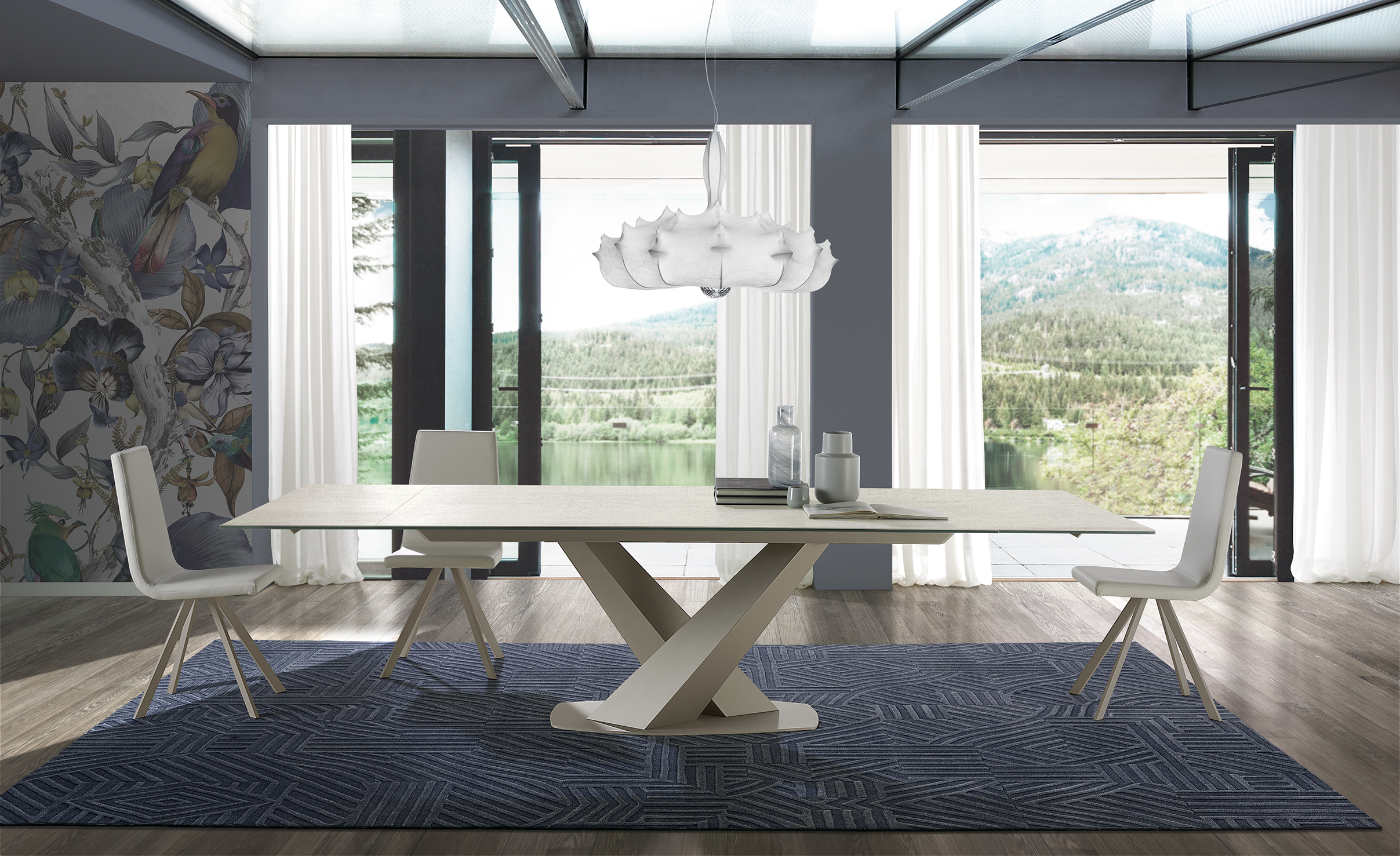 Mesa comedor extensible modelo Victory con estructura Titanio y tapa Blaze Snow.