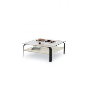 Mesa central con tapa cristal transparente, revistero madera y patas en metal.