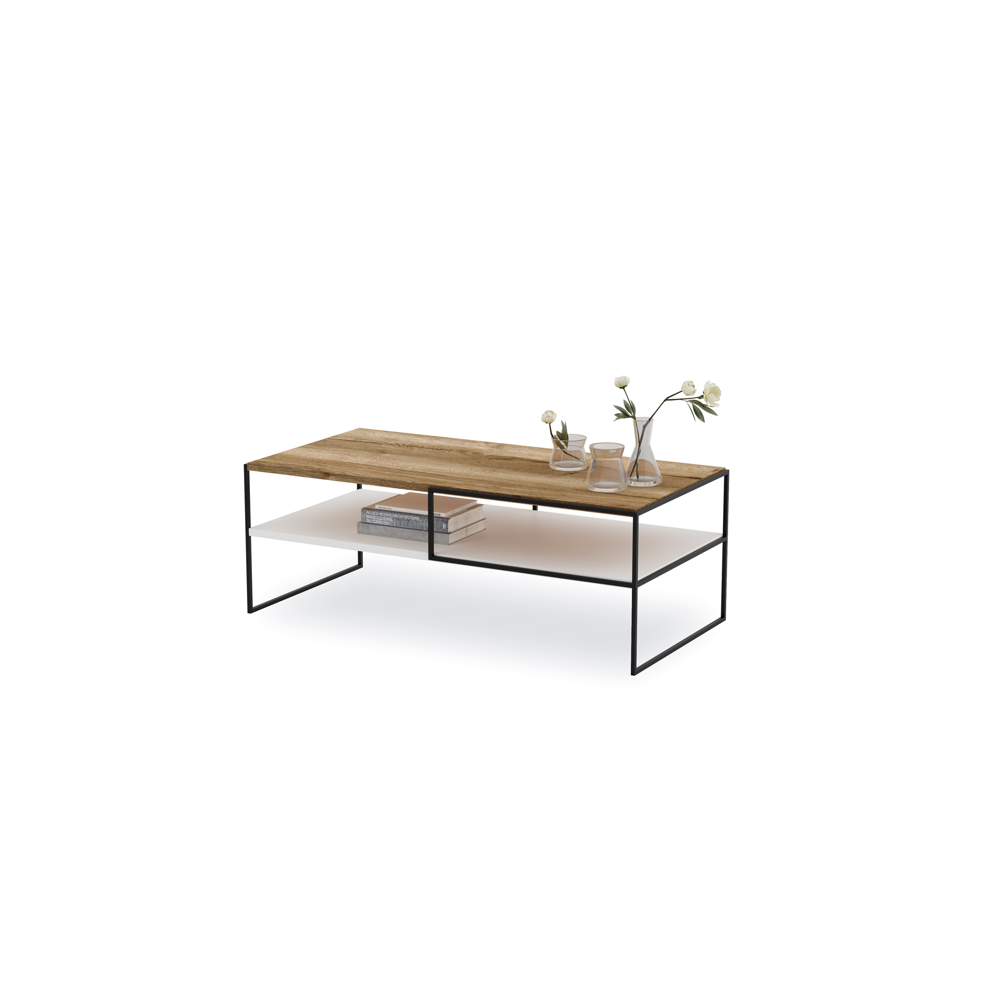 Mesa central con tapa de madera, revistero y estructura metálica.
