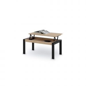 Mesa central tapa madera elevable y patas metálicas.