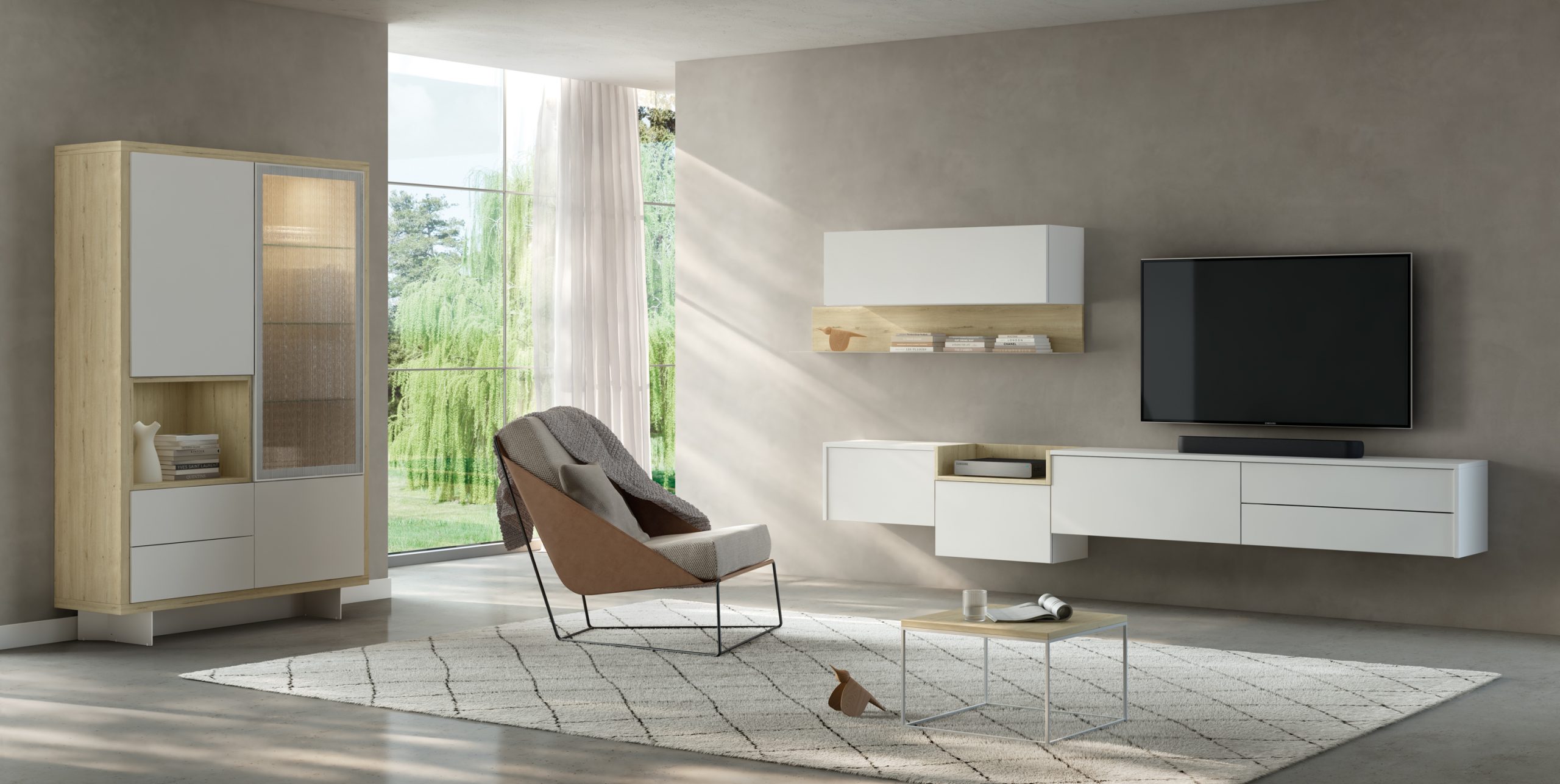 Ambiente que combina mueble de tv volado y una vitrina, la pieza estrella en el salón – comedor.
