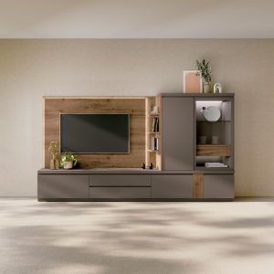 Composición con panel retroiluminado ,estantería lateral abierta y un cajón interno en la vitrina hacen un ambiente diferente.