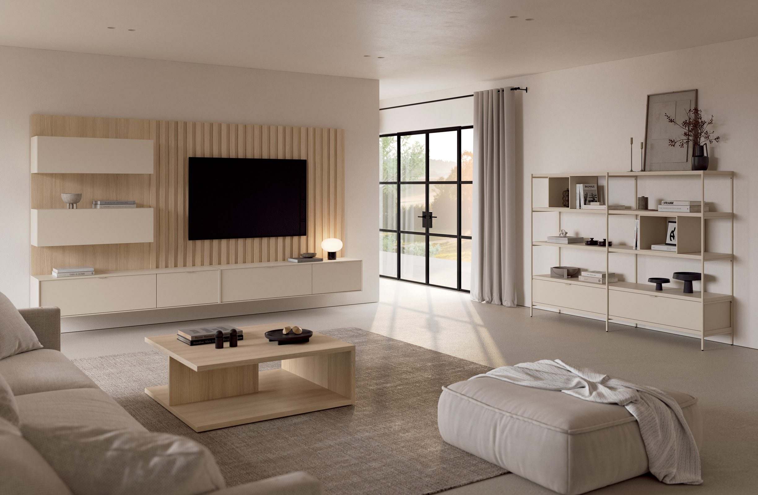 Composición de mueble de salón con un bajo tv que combina puertas, cajones y huecos.