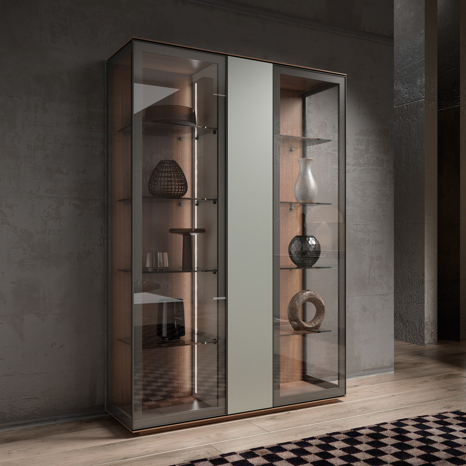 Mientras tanto, la vitrina con estante central y laterales de cristal permite exhibir tus piezas favoritas con elegancia.