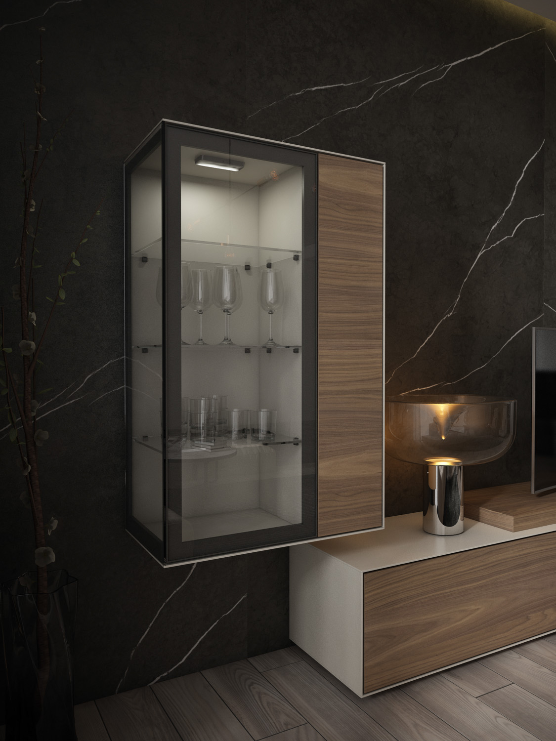 Esta zona está fabricada en madera con laterales de cristal, lo que permite exhibir elementos decorativos o vajilla con una iluminación sutil y elegante.