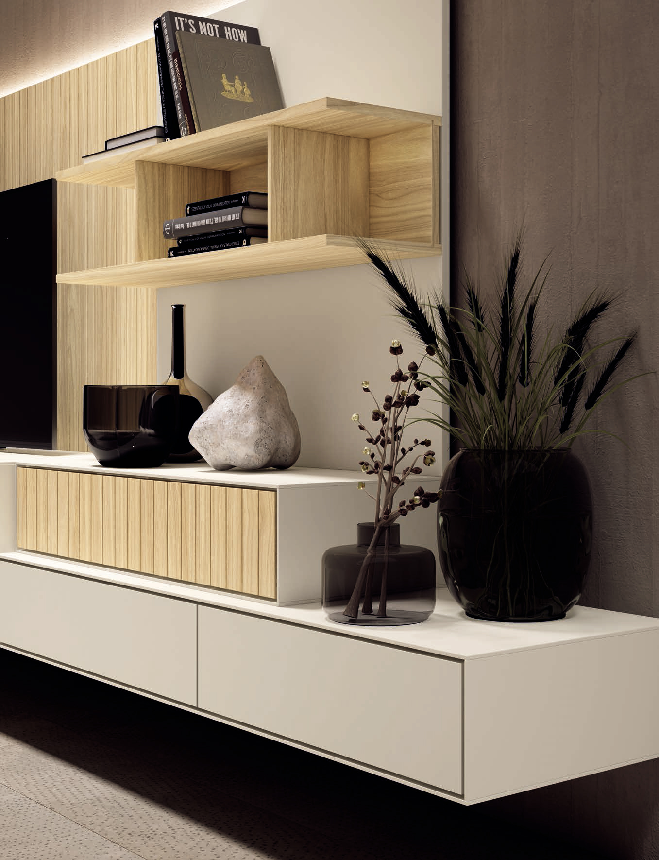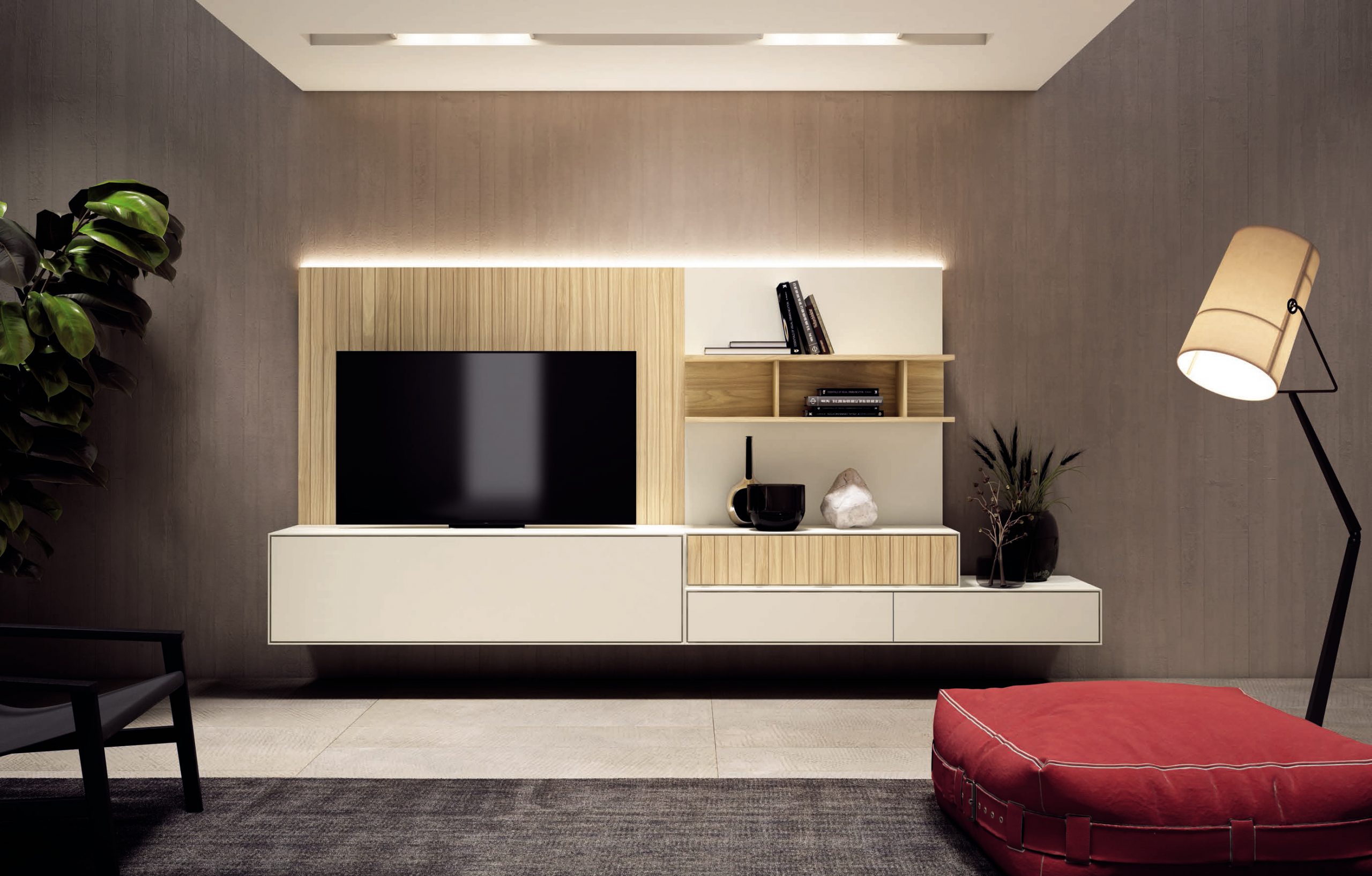 ![Mueble de Salón LOFT NEO 20 en Perla y Castaño Rayado](alt=»Mueble de Salón LOFT NEO 20 colgado de pared, acabado en Perla, Castaño y Castaño Rayado, con panel de TV iluminado y estante abierto»)