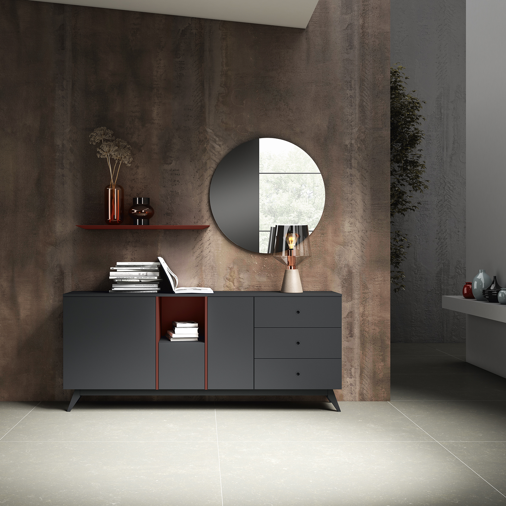 Este aparador combina formas equilibradas y líneas limpias, creando una estética actual con un toque de originalidad. Sus patas metálicas despuntadas aportan ligereza visual, mientras que el contraste de colores entre grafito y teja le confiere carácter y distinción.
