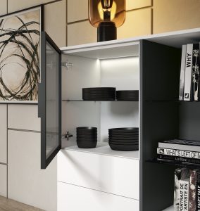 El sistema de apertura push refuerza la limpieza visual, eliminando tiradores visibles y ofreciendo una experiencia de uso cómoda y moderna.