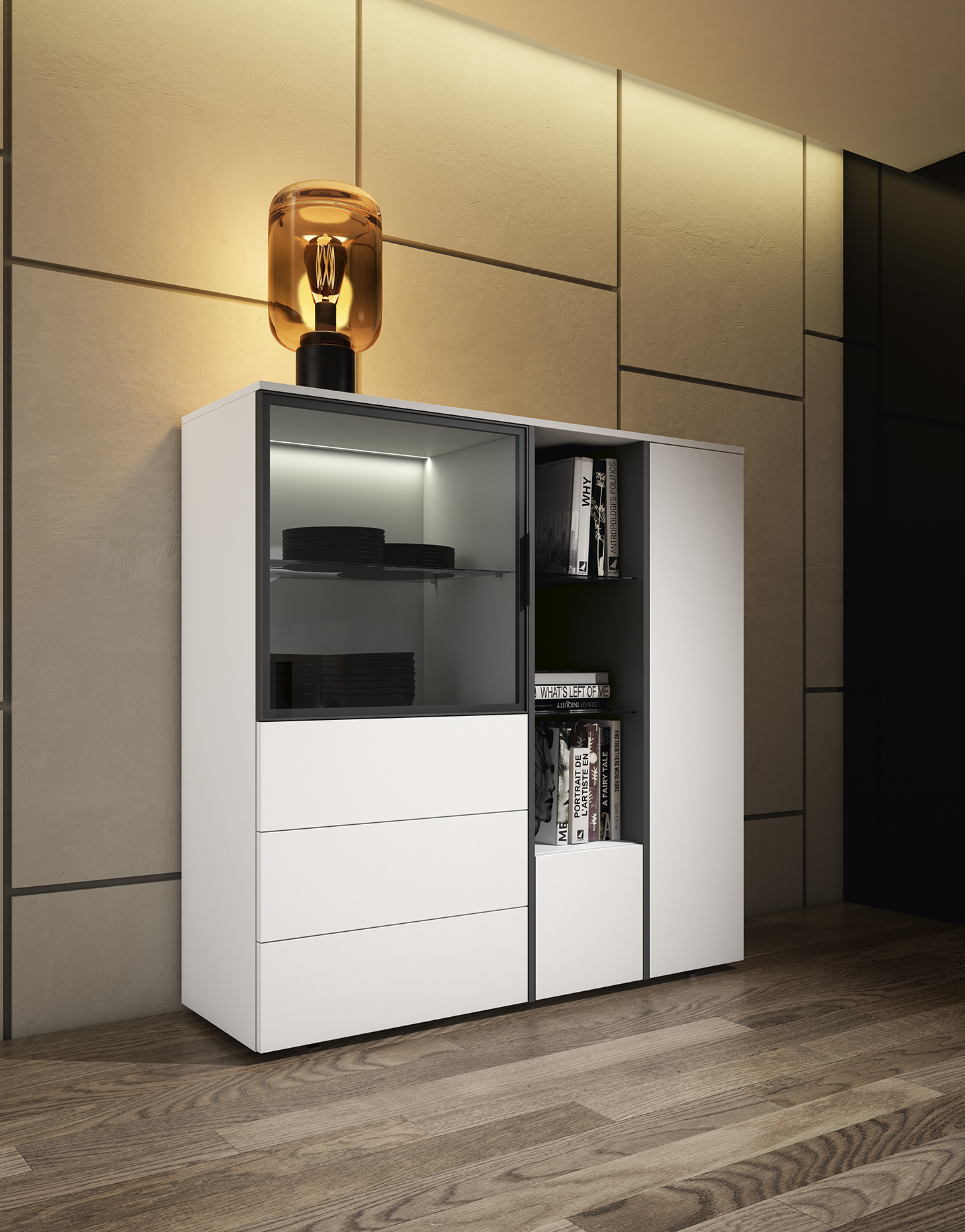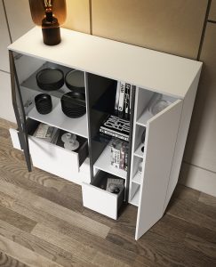 Fabricado con materiales resistentes y lacas de primera calidad, este aparador destaca por su durabilidad y acabado impecable. Los tonos blanco y grafito crean un contraste elegante que combina con estilos decorativos variados, desde ambientes minimalistas hasta estancias más clásicas.